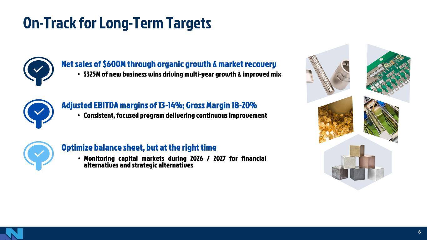 5 Investment Thesis: Comprehensive Transformation Remains On-Track Ramping Up Significant Amount of New Wins Positioned for Recovery in Legacy Business Transforming Revenue & Cost Profile Purposeful mix shift to higher margin products and growth in attractive end markets, Coupled with targeted cost reductions and prudent capital allocation and balance sheet management