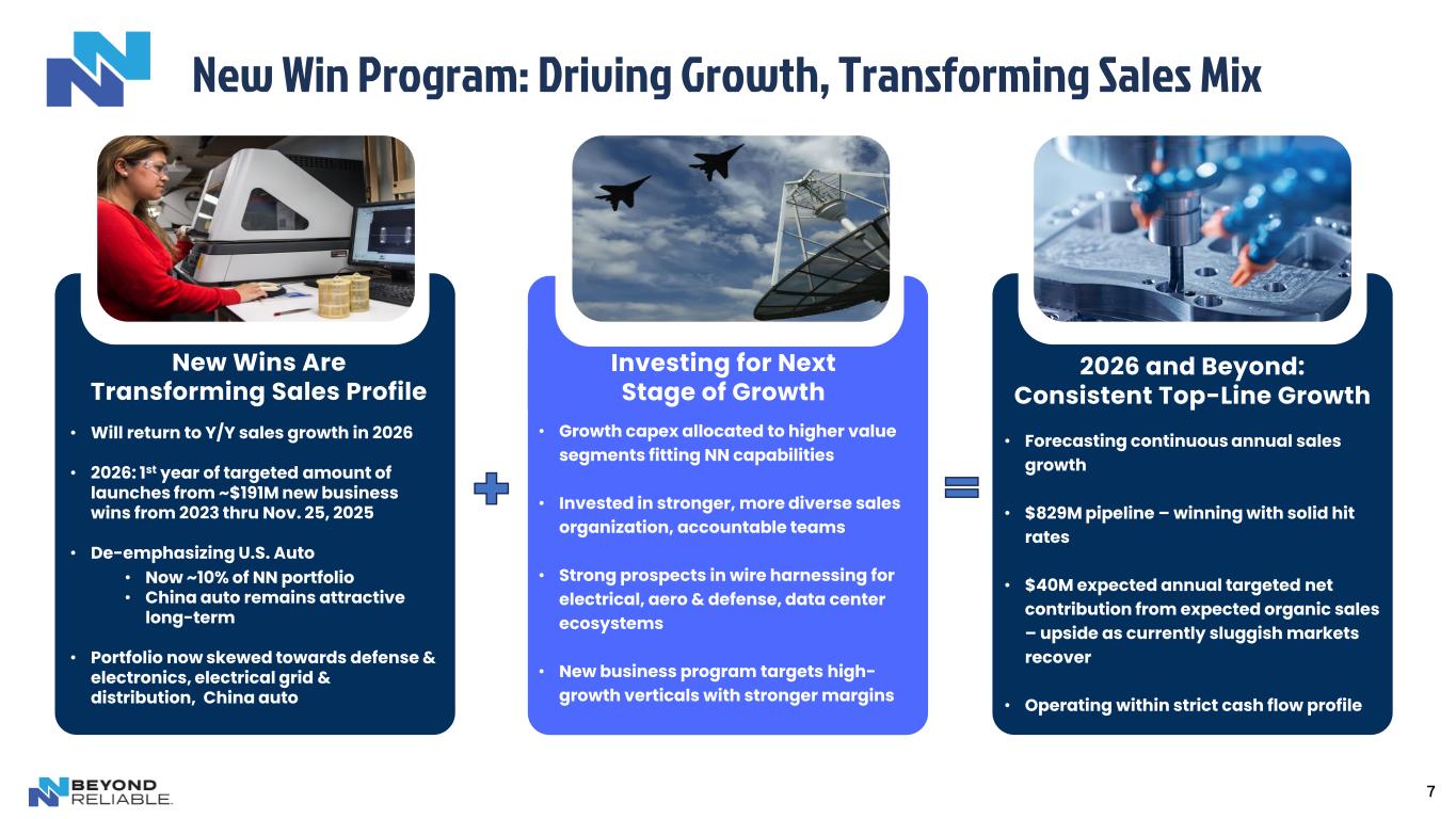7 New Win Program: Driving Growth, Transforming Sales Mix New Wins Are Transforming Sales Profile • Will return to Y/Y sales growth in 2026 • 2026: 1st year of targeted amount of launches from ~$191M new business wins from 2023 thru Nov. 25, 2025 • De-emphasizing U.S. Auto • Now ~10% of NN portfolio • China auto remains attractive long-term • Portfolio now skewed towards defense & electronics, electrical grid & distribution, China auto 2026 and Beyond: Consistent Top-Line Growth • Forecasting continuous annual sales growth • $829M pipeline – winning with solid hit rates • $40M expected annual targeted net contribution from expected organic sales – upside as currently sluggish markets recover • Operating within strict cash flow profile Investing for Next Stage of Growth • Growth capex allocated to higher value segments fitting NN capabilities • Invested in stronger, more diverse sales organization, accountable teams • Strong prospects in wire harnessing for electrical, aero & defense, data center ecosystems • New business program targets high- growth verticals with stronger margins