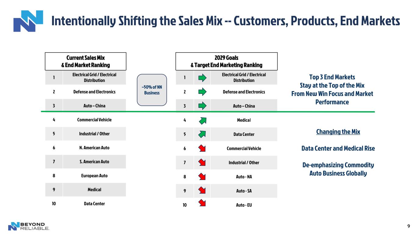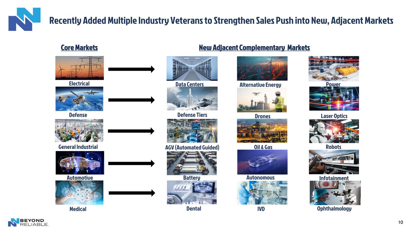 Intentionally Shifting the Sales Mix -- Customers, Products, End Markets 9 Current Sales Mix & End Market Ranking 1 Electrical Grid / Electrical Distribution 2 Defense and Electronics 3 Auto – China 4 Commercial Vehicle 5 Industrial / Other 6 N. American Auto 7 S. American Auto 8 European Auto 9 Medical 10 Data Center Top 3 End Markets Stay at the Top of the Mix From New Win Focus and Market Performance Changing the Mix Data Center and Medical Rise De-emphasizing Commodity Auto Business Globally 2029 Goals & Target End Marketing Ranking 1 Electrical Grid / Electrical Distribution 2 Defense and Electronics 3 Auto – China 4 Medical 5 Data Center 6 Commercial Vehicle 7 Industrial / Other 8 Auto - NA 9 Auto - SA 10 Auto - EU ~50% of NN Business