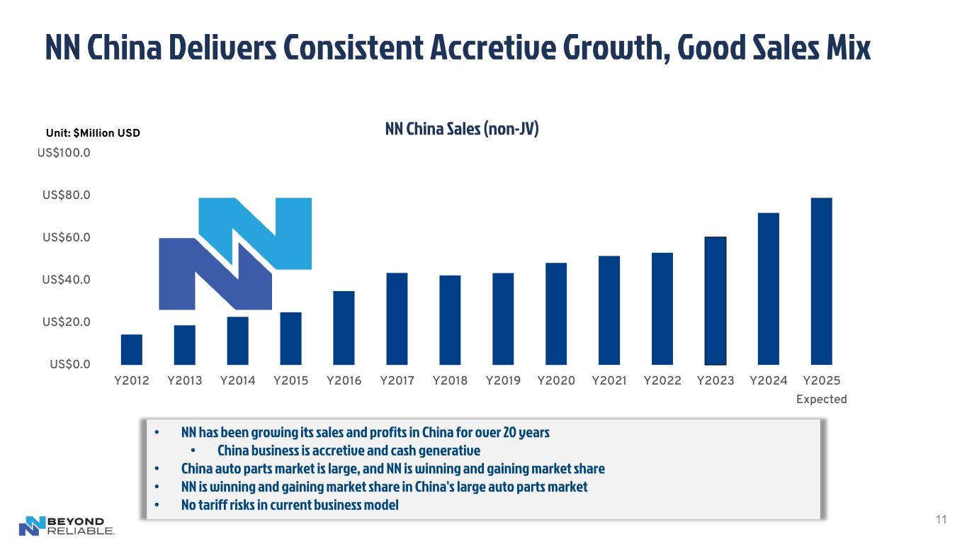 NN China Delivers Consistent Accretive Growth, Good Sales Mix 11 $79.0 US$0.0 US$20.0 US$40.0 US$60.0 US$80.0 US$100.0 Y2012 Y2013 Y2014 Y2015 Y2016 Y2017 Y2018 Y2019 Y2020 Y2021 Y2022 Y2023 Y2024 Y2025 Expected Unit: $Million USD • NN has been growing its sales and profits in China for over 20 years • China business is accretive and cash generative • China auto parts market is large, and NN is winning and gaining market share • NN is winning and gaining market share in China's large auto parts market • No tariff risks in current business model NN China Sales (non-JV)