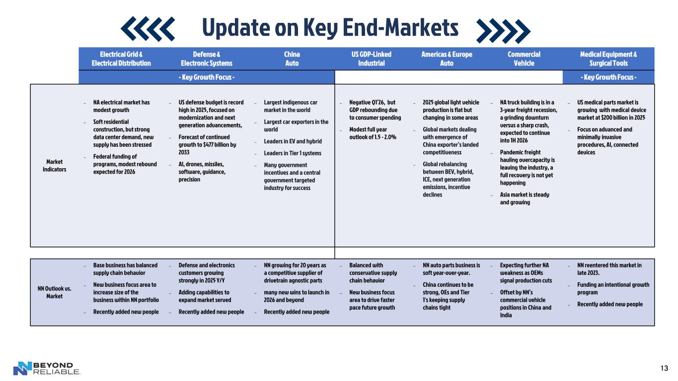 13 Update on Key End-Markets Electrical Grid & Electrical Distribution Defense & Electronic Systems China Auto US GDP-Linked Industrial Americas & Europe Auto Commercial Vehicle Medical Equipment & Surgical Tools - Key Growth Focus - - Key Growth Focus - Market Indicators ― NA electrical market has modest growth ― Soft residential construction, but strong data center demand, new supply has been stressed ― Federal funding of programs, modest rebound expected for 2026 ― US defense budget is record high in 2025, focused on modernization and next generation advancements, ― Forecast of continued growth to $477 billion by 2033 ― AI, drones, missiles, software, guidance, precision ― Largest indigenous car market in the world ― Largest car exporters in the world ― Leaders in EV and hybrid ― Leaders in Tier 1 systems ― Many government incentives and a central government targeted industry for success ― Negative Q1’26, but GDP rebounding due to consumer spending ― Modest full year outlook of 1.5 - 2.0% ― 2025 global light vehicle production is flat but changing in some areas ― Global markets dealing with emergence of China exporter’s landed competitiveness ― Global rebalancing between BEV, hybrid, ICE, next generation emissions, incentive declines ― NA truck building is in a 3-year freight recession, a grinding downturn versus a sharp crash, expected to continue into 1H 2026 ― Pandemic freight hauling overcapacity is leaving the industry, a full recovery is not yet happening ― Asia market is steady and growing ― US medical parts market is growing with medical device market at $200 billion in 2025 ― Focus on advanced and minimally invasive procedures, AI, connected devices NN Outlook vs. Market ― Base business has balanced supply chain behavior ― New business focus area to increase size of the business within NN portfolio ― Recently added new people ― Defense and electronics customers growing strongly in 2025 Y/Y ― Adding capabilities to expand market served ― Recently added new people ― NN growing for 20 years as a competitive supplier of drivetrain agnostic parts ― many new wins to launch in 2026 and beyond ― Recently added new people ― Balanced with conservative supply chain behavior ― New business focus area to drive faster pace future growth ― NN auto parts business is soft year-over-year. ― China continues to be strong, OEs and Tier 1's keeping supply chains tight ― Expecting further NA weakness as OEMs signal production cuts ― Offset by NN’s commercial vehicle positions in China and India ― NN reentered this market in late 2023. ― Funding an intentional growth program ― Recently added new people