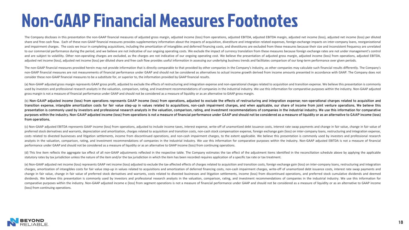 18 The Company discloses in this presentation the non-GAAP financial measures of adjusted gross margin, adjusted income (loss) from operations, adjusted EBITDA, adjusted EBITDA margin, adjusted net income (loss), adjusted net income (loss) per diluted share and free cash flow. Each of these non-GAAP financial measures provides supplementary information about the impacts of acquisition, divestiture and integration related expenses, foreign-exchange impacts on inter-company loans, reorganizational and impairment charges. The costs we incur in completing acquisitions, including the amortization of intangibles and deferred financing costs, and divestitures are excluded from these measures because their size and inconsistent frequency are unrelated to our commercial performance during the period, and we believe are not indicative of our ongoing operating costs. We exclude the impact of currency translation from these measures because foreign exchange rates are not under management’s control and are subject to volatility. Other non-operating charges are excluded, as the charges are not indicative of our ongoing operating cost. We believe the presentation of adjusted gross margin, adjusted income (loss) from operations, adjusted EBITDA, adjusted net income (loss), adjusted net income (loss) per diluted share and free cash flow provides useful information in assessing our underlying business trends and facilitates comparison of our long-term performance over given periods. The non-GAAP financial measures provided herein may not provide information that is directly comparable to that provided by other companies in the Company's industry, as other companies may calculate such financial results differently. The Company's non-GAAP financial measures are not measurements of financial performance under GAAP and should not be considered as alternatives to actual income growth derived from income amounts presented in accordance with GAAP. The Company does not consider these non-GAAP financial measures to be a substitute for, or superior to, the information provided by GAAP financial results. (a) Non-GAAP adjusted gross margin represents GAAP gross profit, adjusted to exclude the effects of restructuring and integration expense and non-operational charges related to acquisition and transition expense. We believe this presentation is commonly used by investors and professional research analysts in the valuation, comparison, rating, and investment recommendations of companies in the industrial industry. We use this information for comparative purposes within the industry. Non-GAAP adjusted gross margin is not a measure of financial performance under GAAP and should not be considered as a measure of liquidity or as an alternative to GAAP gross margin. (b) Non-GAAP adjusted income (loss) from operations represents GAAP income (loss) from operations, adjusted to exclude the effects of restructuring and integration expense; non-operational charges related to acquisition and transition expense, intangible amortization costs for fair value step-up in values related to acquisitions, non-cash impairment charges, and when applicable, our share of income from joint venture operations. We believe this presentation is commonly used by investors and professional research analysts in the valuation, comparison, rating, and investment recommendations of companies in the industrial industry. We use this information for comparative purposes within the industry. Non-GAAP adjusted income (loss) from operations is not a measure of financial performance under GAAP and should not be considered as a measure of liquidity or as an alternative to GAAP income (loss) from operations. (c) Non-GAAP adjusted EBITDA represents GAAP income (loss) from operations, adjusted to include income taxes, interest expense, write-off of unamortized debt issuance costs, interest rate swap payments and change in fair value, change in fair value of preferred stock derivatives and warrants, depreciation and amortization, charges related to acquisition and transition costs, non-cash stock compensation expense, foreign exchange gain (loss) on inter-company loans, restructuring and integration expense, costs related to divested businesses and litigation settlements, income from discontinued operations, and non-cash impairment charges, to the extent applicable. We believe this presentation is commonly used by investors and professional research analysts in the valuation, comparison, rating, and investment recommendations of companies in the industrial industry. We use this information for comparative purposes within the industry. Non-GAAP adjusted EBITDA is not a measure of financial performance under GAAP and should not be considered as a measure of liquidity or as an alternative to GAAP income (loss) from continuing operations. (d) This line item reflects the aggregate tax effect of all non-GAAP adjustments reflected in the respective table. The Company estimates the tax effect of the adjustment items identified in the reconciliation schedule above by applying the applicable statutory rates by tax jurisdiction unless the nature of the item and/or the tax jurisdiction in which the item has been recorded requires application of a specific tax rate or tax treatment. (e) Non-GAAP adjusted net income (loss) represents GAAP net income (loss) adjusted to exclude the tax-affected effects of charges related to acquisition and transition costs, foreign exchange gain (loss) on inter-company loans, restructuring and integration charges, amortization of intangibles costs for fair value step-up in values related to acquisitions and amortization of deferred financing costs, non-cash impairment charges, write-off of unamortized debt issuance costs, interest rate swap payments and change in fair value, change in fair value of preferred stock derivatives and warrants, costs related to divested businesses and litigation settlements, income (loss) from discontinued operati
