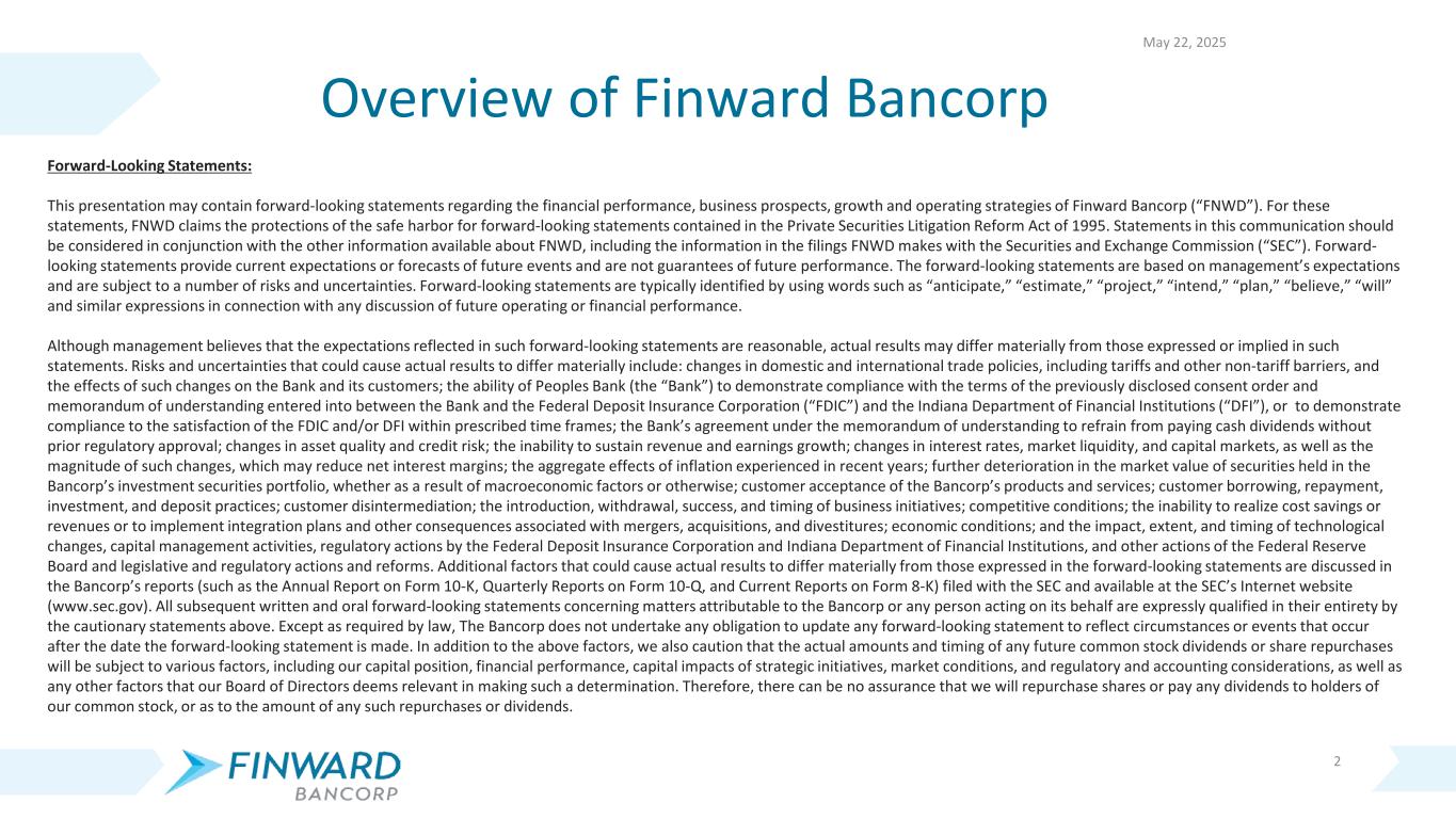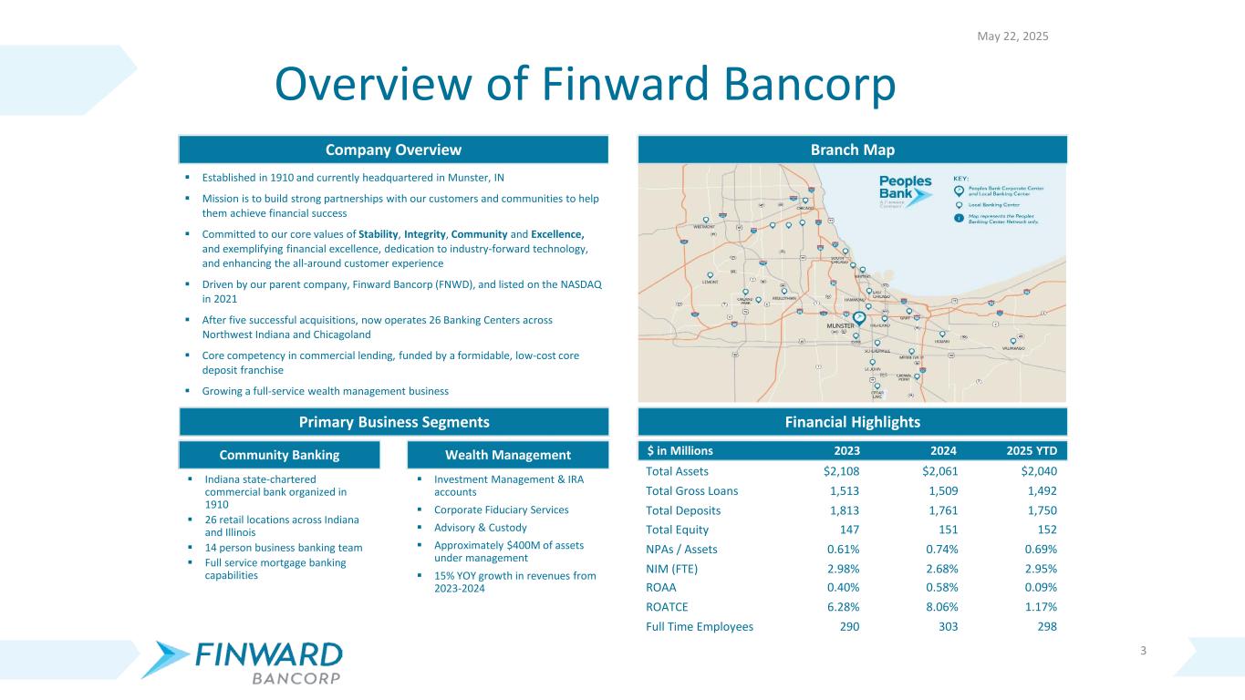 2 Overview of Finward Bancorp May 22, 2025 Forward-Looking Statements: This presentation may contain forward-looking statements regarding the financial performance, business prospects, growth and operating strategies of Finward Bancorp (“FNWD”). For these statements, FNWD claims the protections of the safe harbor for forward-looking statements contained in the Private Securities Litigation Reform Act of 1995. Statements in this communication should be considered in conjunction with the other information available about FNWD, including the information in the filings FNWD makes with the Securities and Exchange Commission (“SEC”). Forward- looking statements provide current expectations or forecasts of future events and are not guarantees of future performance. The forward-looking statements are based on management’s expectations and are subject to a number of risks and uncertainties. Forward-looking statements are typically identified by using words such as “anticipate,” “estimate,” “project,” “intend,” “plan,” “believe,” “will” and similar expressions in connection with any discussion of future operating or financial performance. Although management believes that the expectations reflected in such forward-looking statements are reasonable, actual results may differ materially from those expressed or implied in such statements. Risks and uncertainties that could cause actual results to differ materially include: changes in domestic and international trade policies, including tariffs and other non-tariff barriers, and the effects of such changes on the Bank and its customers; the ability of Peoples Bank (the “Bank”) to demonstrate compliance with the terms of the previously disclosed consent order and memorandum of understanding entered into between the Bank and the Federal Deposit Insurance Corporation (“FDIC”) and the Indiana Department of Financial Institutions (“DFI”), or to demonstrate compliance to the satisfaction of the FDIC and/or DFI within prescribed time frames; the Bank’s agreement under the memorandum of understanding to refrain from paying cash dividends without prior regulatory approval; changes in asset quality and credit risk; the inability to sustain revenue and earnings growth; changes in interest rates, market liquidity, and capital markets, as well as the magnitude of such changes, which may reduce net interest margins; the aggregate effects of inflation experienced in recent years; further deterioration in the market value of securities held in the Bancorp’s investment securities portfolio, whether as a result of macroeconomic factors or otherwise; customer acceptance of the Bancorp’s products and services; customer borrowing, repayment, investment, and deposit practices; customer disintermediation; the introduction, withdrawal, success, and timing of business initiatives; competitive conditions; the inability to realize cost savings or revenues or to implement integration plans and other consequences associated with mergers, acquisitions, and divestitures; economic conditions; and the impact, extent, and timing of technological changes, capital management activities, regulatory actions by the Federal Deposit Insurance Corporation and Indiana Department of Financial Institutions, and other actions of the Federal Reserve Board and legislative and regulatory actions and reforms. Additional factors that could cause actual results to differ materially from those expressed in the forward-looking statements are discussed in the Bancorp’s reports (such as the Annual Report on Form 10-K, Quarterly Reports on Form 10-Q, and Current Reports on Form 8-K) filed with the SEC and available at the SEC’s Internet website (www.sec.gov). All subsequent written and oral forward-looking statements concerning matters attributable to the Bancorp or any person acting on its behalf are expressly qualified in their entirety by the cautionary statements above. Except as required by law, The Bancorp does not undertake any obligation to update any forward-looking statement to reflect circumstances or events that occur after the date the forward-looking statement is made. In addition to the above factors, we also caution that the actual amounts and timing of any future common stock dividends or share repurchases will be subject to various factors, including our capital position, financial performance, capital impacts of strategic initiatives, market conditions, and regulatory and accounting considerations, as well as any other factors that our Board of Directors deems relevant in making such a determination. Therefore, there can be no assurance that we will repurchase shares or pay any dividends to holders of our common stock, or as to the amount of any such repurchases or dividends.
