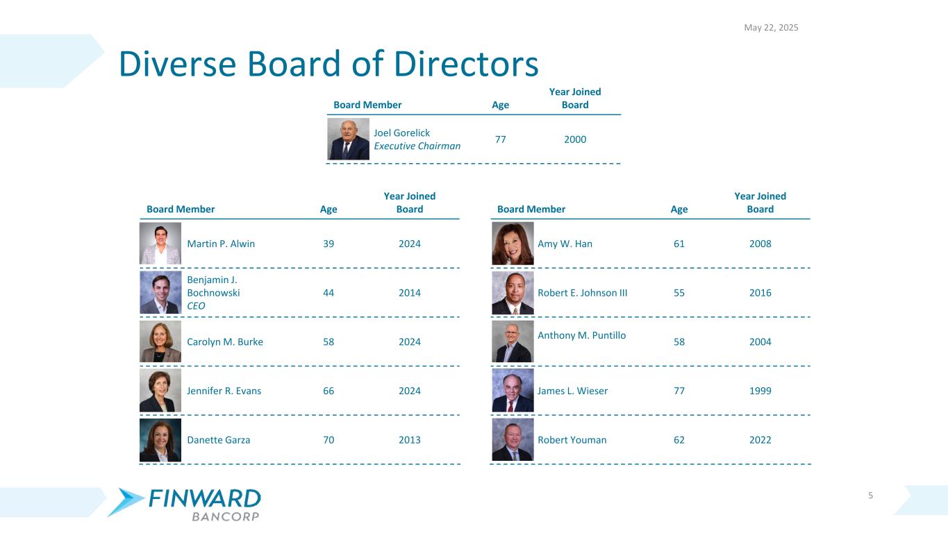 4 Executive Management Team Officer Years of Banking Experience Year Started in Current Position Year Started at Finward Bancorp Position with Company Benjamin J. Bochnowski 16 2016 2010 President & Chief Executive Officer Robert T. Lowry 39 2021 1985 Executive VP & Chief Operating Officer Todd M. Scheub 32 2022 1996 Executive VP, Chief Revenue Officer & Peoples Bank President Benjamin Schmitt 20 2024 2024 Executive VP, Chief Financial Officer and Treasurer David Kwait 14 2023 2011 Senior VP & Chief Risk Officer, General Counsel and Corporate Secretary Jill Washington 21 2021 2021 Senior VP & Chief People Officer  Deep leadership team with decades of combined experience  Seasoned banking team with deep ties to core operating markets  Risk-aligned corporate culture, promoting responsibility and accountability May 22, 2025