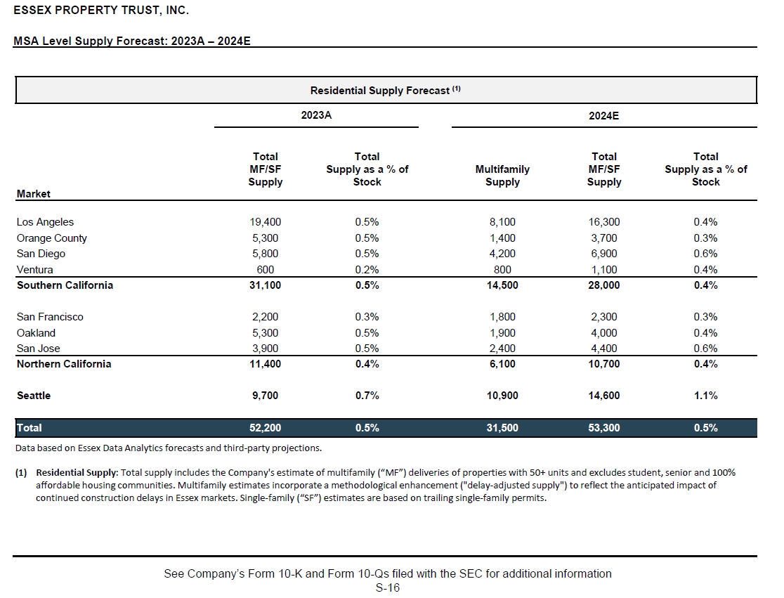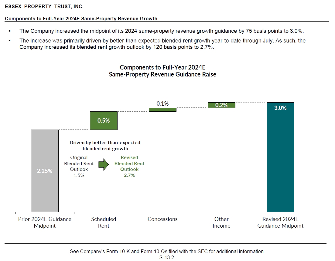 San Mateo, California—July 30, 2024—Essex Property Trust, Inc. (NYSE: ESS) (the “Company”) announced today its second quarter 2024 earnings results and related business activities.
