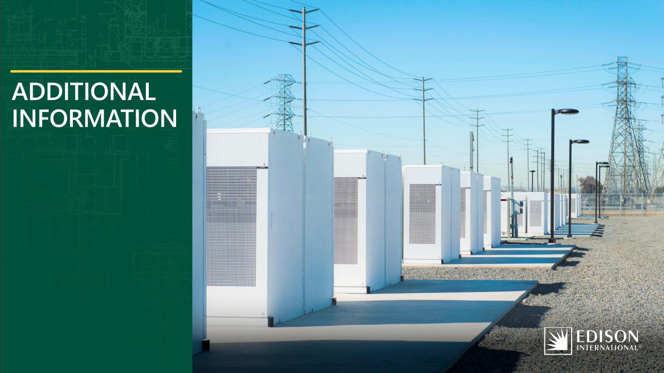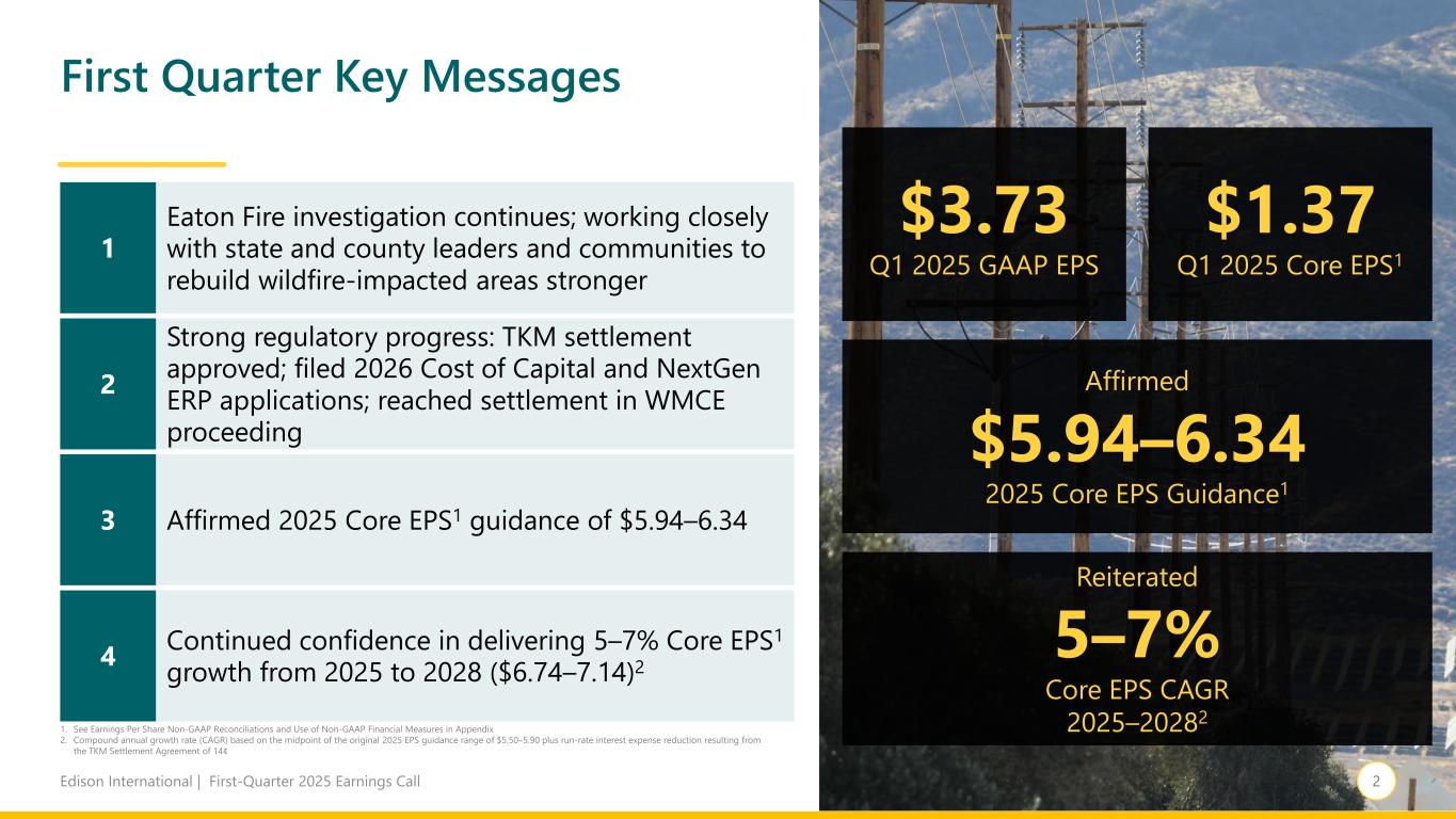 1Edison International | First-Quarter 2025 Earnings Call Statements contained in this presentation about future performance, including, without limitation, operating results, capital expenditures, rate base growth, dividend policy, financial outlook, and other statements that are not purely historical, are forward-looking statements. These forward-looking statements reflect our current expectations; however, such statements involve risks and uncertainties. Actual results could differ materially from current expectations. These forward-looking statements represent our expectations only as of the date of this presentation, and Edison International assumes no duty to update them to reflect new information, events or circumstances. Important factors that could cause different results include, but are not limited to the: • ability of SCE to recover its costs through regulated rates, timely or at all, including uninsured wildfire-related and debris flow-related costs (including amounts paid for self-insured retention and co-insurance, and amounts not recoverable from the Wildfire Insurance Fund), and costs incurred for wildfire restoration efforts and to mitigate the risk of utility equipment causing future wildfires; • the cybersecurity of Edison International's and SCE's critical information technology systems for grid control and business, employee and customer data, and the physical security of Edison International's and SCE's critical assets and personnel; • risks associated with the operation and maintenance of electrical facilities, including worker, contractor, and public safety issues, the risk of utility assets causing or contributing to wildfires, failure, availability, efficiency, and output of equipment and facilities, and availability and cost of spare parts; • impact of affordability of customer rates on SCE's ability to execute its strategy, including the impact of affordability on SCE’s ability to obtain regulatory approval of, or cost recovery for, operations and maintenance expenses, proposed capital investment projects, and increased costs due to supply chain constraints, tariffs, inflation and rising interest rates; • ability of SCE to update its grid infrastructure to maintain system integrity and reliability, and meet electrification needs; • ability of SCE to implement its operational and strategic plans, including its Wildfire Mitigation Plan and capital investment program, including those related to project site identification, public opposition, environmental mitigation, construction, permitting, contractor performance, changes in the California Independent System Operator's (“CAISO”) transmission plans, and governmental approvals; • risks of regulatory or legislative restrictions that would limit SCE's ability to implement operational measures to mitigate wildfire risk, including Public Safety Power Shutoff (“PSPS”) and fast curve settings, when conditions warrant or would otherwise limit SCE's operational practices relative to wildfire risk mitigation; • ability of SCE to obtain safety certifications from the Office of Energy Infrastructure Safety of the California Natural Resources Agency (“OEIS“); • risk that California Assembly Bill 1054 (“AB 1054“) does not effectively mitigate the significant exposure faced by California investor-owned utilities related to liability for damages arising from catastrophic wildfires where utility facilities are alleged to be a substantial cause, including the longevity of the Wildfire Insurance Fund and the California Public Utilities Commission (“CPUC”) interpretation of and actions under AB 1054, including its interpretation of the prudency standard clarified by AB 1054; • ability of Edison International and SCE to effectively attract, manage, develop and retain a skilled workforce, including its contract workers; • decisions and other actions by the CPUC, the Federal Energy Regulatory Commission, and the United States Nuclear Regulatory Commission and other governmental authorities, including decisions and actions related to nationwide or statewide crisis, approval of regulatory proceeding settlements, determinations of authorized rates of return or return on equity, the recoverability of wildfire-related and debris flow-related costs, issuance of SCE's wildfire safety certification, wildfire mitigation efforts, approval and implementation of electrification programs, and delays in executive, regulatory and legislative actions; • governmental, statutory, regulatory, or administrative changes or initiatives affecting the electricity industry, including the market structure rules applicable to each market adopted by the North American Electric Reliability Corporation, CAISO, Western Electricity Coordinating Council, and similar regulatory bodies in adjoining regions, and changes in the United States' and California's environmental priorities that lessen the importance placed on greenhouse gas reduction and other climate related priorities; • potential for penalties or disallowances for non-compliance with applicable laws and regulations, including fines, penalties and disallowances related to wildfires where SCE's equipment is alleged to be associated with ignition; • extreme weather-related incidents (including events caused, or exacerbated, by climate change), such as wildfires, debris flows, flooding, droughts, high wind events and extreme heat events and other natural disasters (such as earthquakes), which could cause, among other things, worker and public safety issues, property damage, outages and other operational issues (such as issues due to damaged infrastructure), PSPS activations and unanticipated costs; • risks associated with the decommissioning of San Onofre, including those related to worker and public safety, public opposition, permitting, governmental approvals, on-site storage of spent nuclear fuel and other radioactive material, delays, contractual disputes,