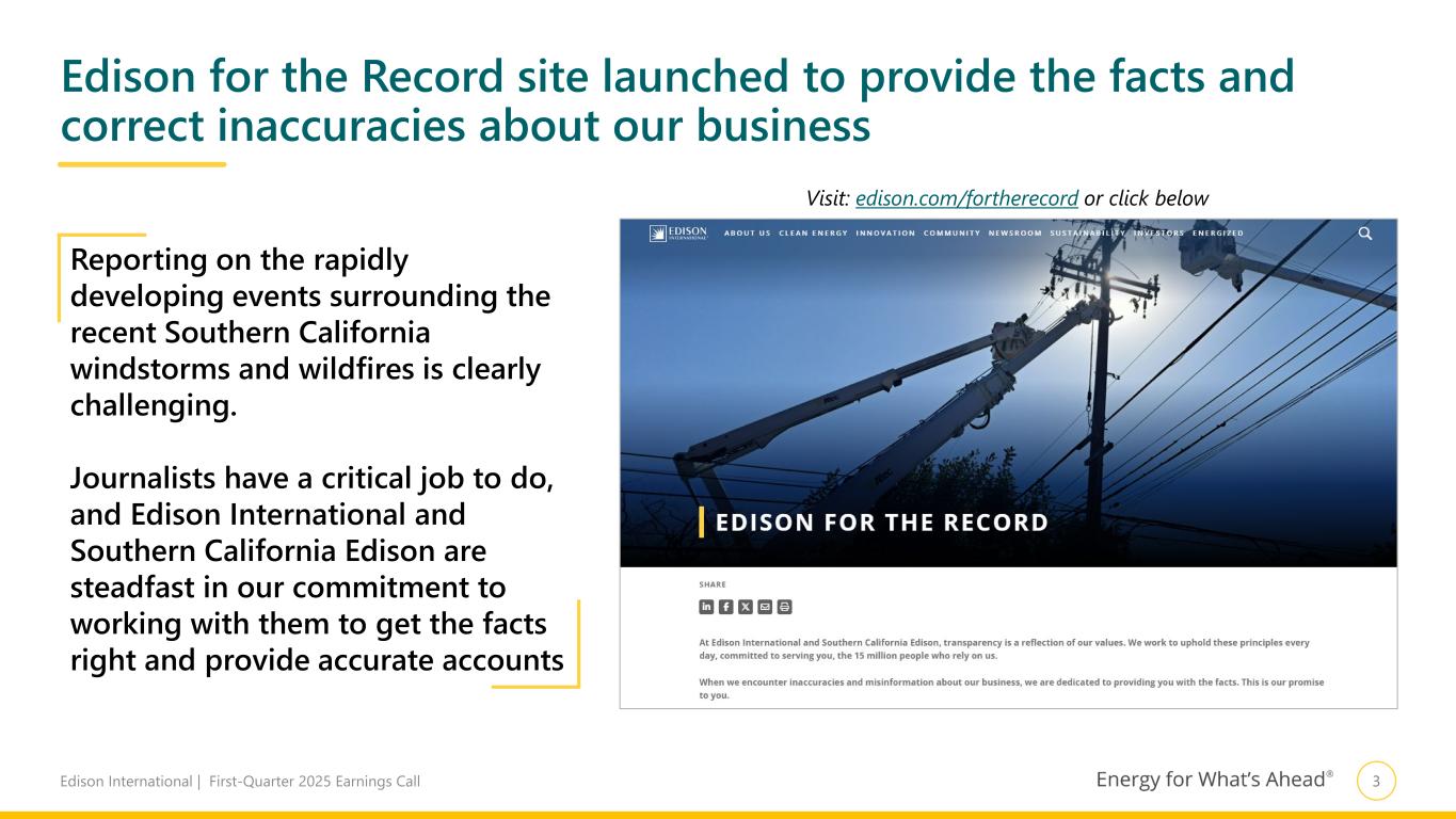 3Edison International | First-Quarter 2025 Earnings Call Edison for the Record site launched to provide the facts and correct inaccuracies about our business Reporting on the rapidly developing events surrounding the recent Southern California windstorms and wildfires is clearly challenging. Journalists have a critical job to do, and Edison International and Southern California Edison are steadfast in our commitment to working with them to get the facts right and provide accurate accounts Visit: edison.com/fortherecord or click below