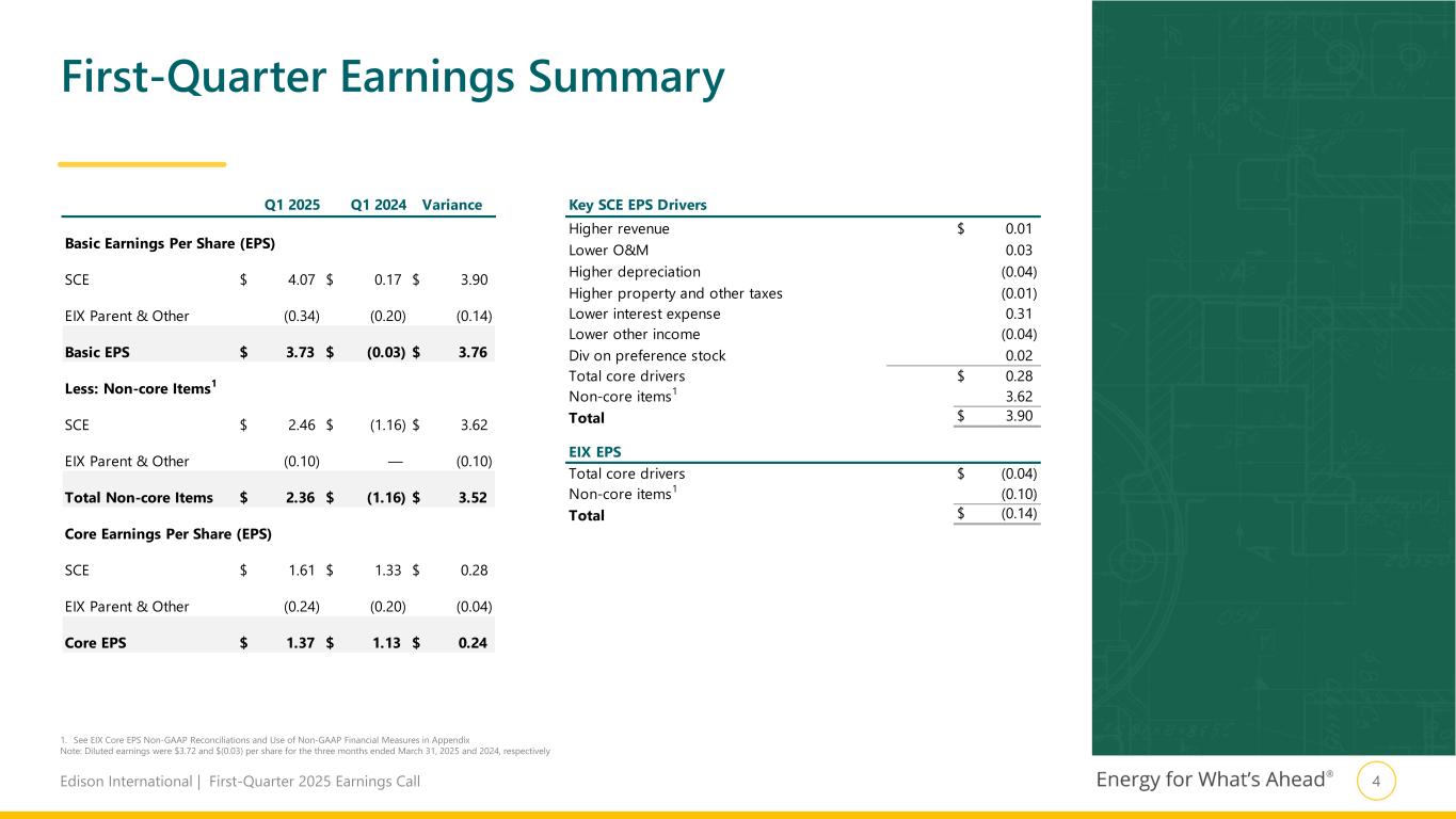 2Edison International | First-Quarter 2025 Earnings Call First Quarter Key Messages $3.73 Q1 2025 GAAP EPS $1.37 Q1 2025 Core EPS1 Reiterated 5–7% Core EPS CAGR 2025–20282 Affirmed $5.94–6.34 2025 Core EPS Guidance1 Eaton Fire investigation continues; working closely with state and county leaders and communities to rebuild wildfire-impacted areas stronger Strong regulatory progress: TKM settlement approved; filed 2026 Cost of Capital and NextGen ERP applications; reached settlement in WMCE proceeding Affirmed 2025 Core EPS1 guidance of $5.94–6.34 1. See Earnings Per Share Non-GAAP Reconciliations and Use of Non-GAAP Financial Measures in Appendix 2. Compound annual growth rate (CAGR) based on the midpoint of the original 2025 EPS guidance range of $5.50–5.90 plus run-rate interest expense reduction resulting from the TKM Settlement Agreement of 14¢ Continued confidence in delivering 5–7% Core EPS1 growth from 2025 to 2028 ($6.74–7.14)2 1 2 3 4