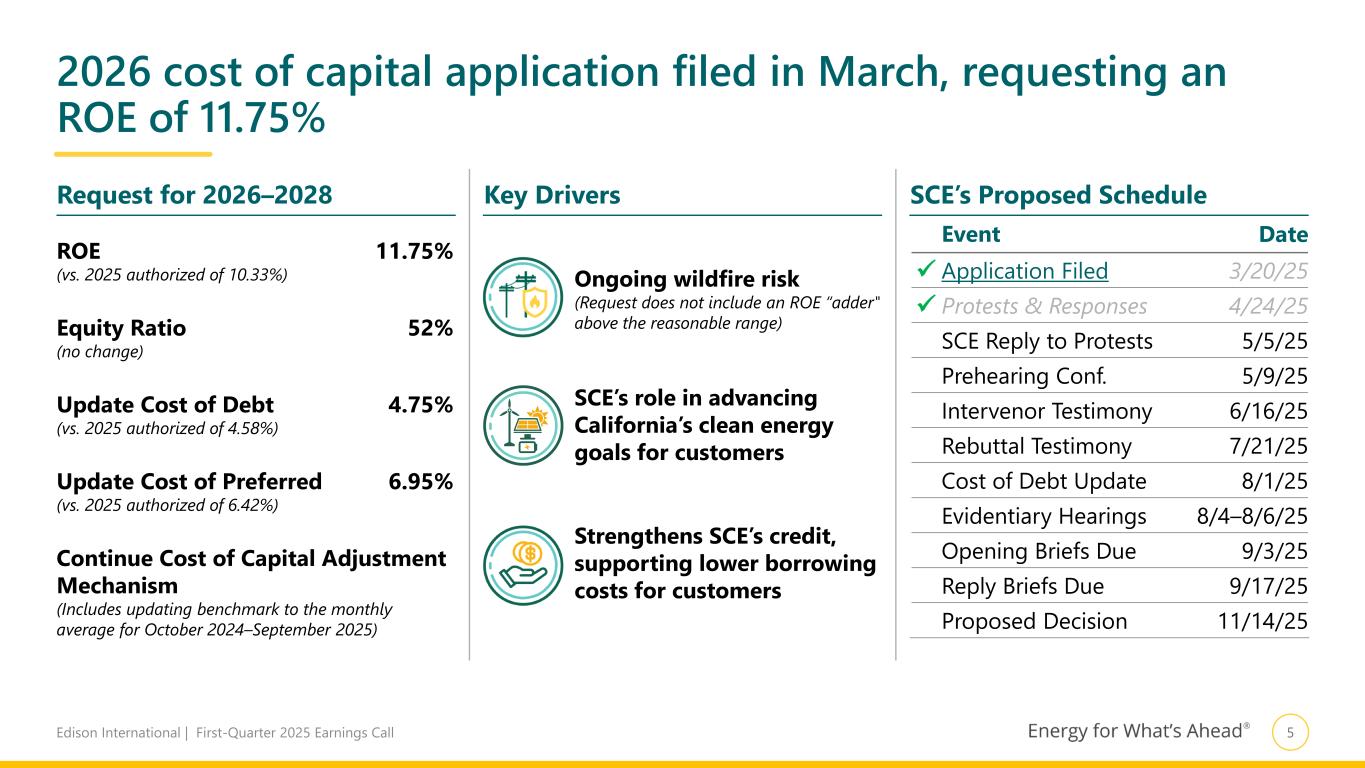 4Edison International | First-Quarter 2025 Earnings Call Key SCE EPS Drivers Higher revenue 0.01$ Lower O&M 0.03 Higher depreciation (0.04) Higher property and other taxes (0.01) Lower interest expense 0.31 Lower other income (0.04) Div on preference stock 0.02 Total core drivers 0.28$ Non-core items1 3.62 Total 3.90$ Total core drivers (0.04)$ Non-core items1 (0.10) Total (0.14)$ EIX EPS Q1 2025 Q1 2024 Variance Basic Earnings Per Share (EPS) SCE 4.07$ 0.17$ 3.90$ EIX Parent & Other (0.34) (0.20) (0.14) Basic EPS 3.73$ (0.03)$ 3.76$ Less: Non-core Items1 SCE 2.46$ (1.16)$ 3.62$ EIX Parent & Other (0.10) — (0.10) Total Non-core Items 2.36$ (1.16)$ 3.52$ Core Earnings Per Share (EPS) SCE 1.61$ 1.33$ 0.28$ EIX Parent & Other (0.24) (0.20) (0.04) Core EPS 1.37$ 1.13$ 0.24$ First-Quarter Earnings Summary 1. See EIX Core EPS Non-GAAP Reconciliations and Use of Non-GAAP Financial Measures in Appendix Note: Diluted earnings were $3.72 and $(0.03) per share for the three months ended March 31, 2025 and 2024, respectively