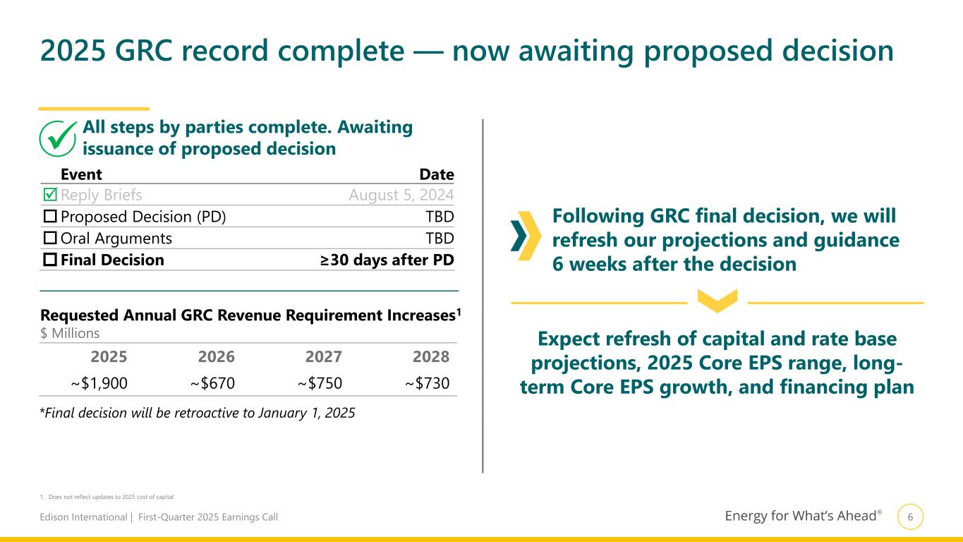 5Edison International | First-Quarter 2025 Earnings Call Ongoing wildfire risk (Request does not include an ROE “adder" above the reasonable range) SCE’s role in advancing California’s clean energy goals for customers Strengthens SCE’s credit, supporting lower borrowing costs for customers 2026 cost of capital application filed in March, requesting an ROE of 11.75% Request for 2026–2028 ROE (vs. 2025 authorized of 10.33%) 11.75% Equity Ratio (no change) 52% Update Cost of Debt (vs. 2025 authorized of 4.58%) 4.75% Update Cost of Preferred (vs. 2025 authorized of 6.42%) 6.95% Continue Cost of Capital Adjustment Mechanism (Includes updating benchmark to the monthly average for October 2024–September 2025) Key Drivers SCE’s Proposed Schedule Event Date  Application Filed 3/20/25  Protests & Responses 4/24/25 SCE Reply to Protests 5/5/25 Prehearing Conf. 5/9/25 Intervenor Testimony 6/16/25 Rebuttal Testimony 7/21/25 Cost of Debt Update 8/1/25 Evidentiary Hearings 8/4–8/6/25 Opening Briefs Due 9/3/25 Reply Briefs Due 9/17/25 Proposed Decision 11/14/25