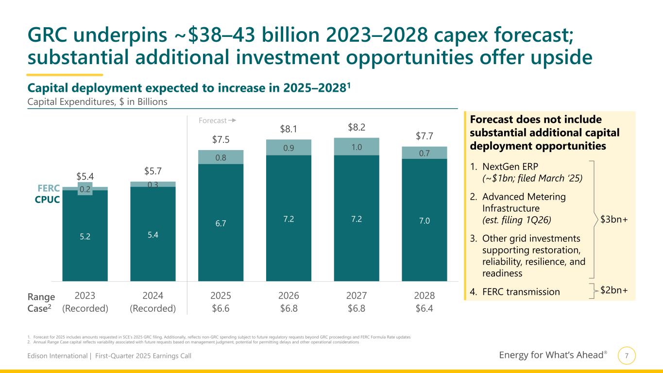 6Edison International | First-Quarter 2025 Earnings Call 2025 GRC record complete — now awaiting proposed decision 1. Does not reflect updates to 2025 cost of capital All steps by parties complete. Awaiting issuance of proposed decision Following GRC final decision, we will refresh our projections and guidance 6 weeks after the decision  Requested Annual GRC Revenue Requirement Increases1 $ Millions 2025 2026 2027 2028 ~$1,900 ~$670 ~$750 ~$730 Event Date Reply Briefs August 5, 2024 Proposed Decision (PD) TBD Oral Arguments TBD Final Decision ≥30 days after PD *Final decision will be retroactive to January 1, 2025 Expect refresh of capital and rate base projections, 2025 Core EPS range, long- term Core EPS growth, and financing plan