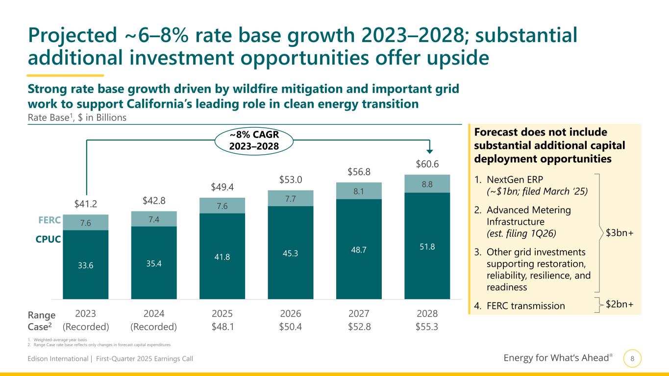 7Edison International | First-Quarter 2025 Earnings Call 5.2 5.4 6.7 7.2 7.2 7.0 0.2 0.3 0.8 0.9 1.0 0.7 $5.4 $5.7 $7.5 $8.1 $8.2 $7.7 2023 2024 2025 2026 2027 2028 Capital deployment expected to increase in 2025–20281 Range Case2 (Recorded) (Recorded) $6.6 $6.8 $6.8 $6.4 GRC underpins ~$38–43 billion 2023–2028 capex forecast; substantial additional investment opportunities offer upside CPUC FERC Capital Expenditures, $ in Billions Forecast does not include substantial additional capital deployment opportunities 1. NextGen ERP (~$1bn; filed March ‘25) 2. Advanced Metering Infrastructure (est. filing 1Q26) 3. Other grid investments supporting restoration, reliability, resilience, and readiness 4. FERC transmission $3bn+ $2bn+ Forecast 1. Forecast for 2025 includes amounts requested in SCE’s 2025 GRC filing. Additionally, reflects non-GRC spending subject to future regulatory requests beyond GRC proceedings and FERC Formula Rate updates 2. Annual Range Case capital reflects variability associated with future requests based on management judgment, potential for permitting delays and other operational considerations