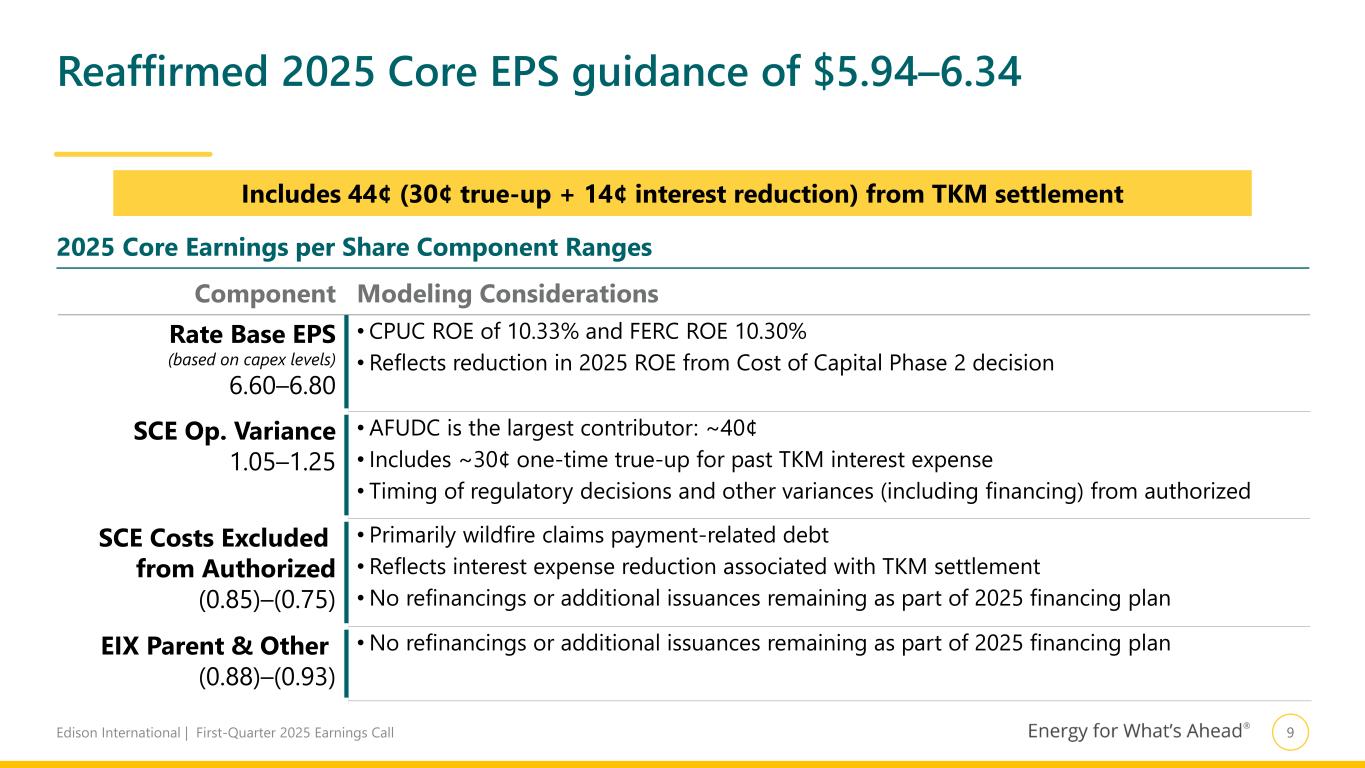 8Edison International | First-Quarter 2025 Earnings Call 33.6 35.4 41.8 45.3 48.7 51.8 7.6 7.4 7.6 7.7 8.1 8.8 $41.2 $42.8 $49.4 $53.0 $56.8 $60.6 2023 2024 2025 2026 2027 2028 Projected ~6–8% rate base growth 2023–2028; substantial additional investment opportunities offer upside CPUC FERC ~8% CAGR 2023–2028 Rate Base1, $ in Billions Strong rate base growth driven by wildfire mitigation and important grid work to support California’s leading role in clean energy transition Range Case2 (Recorded) (Recorded) $48.1 $50.4 $52.8 $55.3 1. Weighted-average year basis 2. Range Case rate base reflects only changes in forecast capital expenditures Forecast does not include substantial additional capital deployment opportunities 1. NextGen ERP (~$1bn; filed March ‘25) 2. Advanced Metering Infrastructure (est. filing 1Q26) 3. Other grid investments supporting restoration, reliability, resilience, and readiness 4. FERC transmission $3bn+ $2bn+