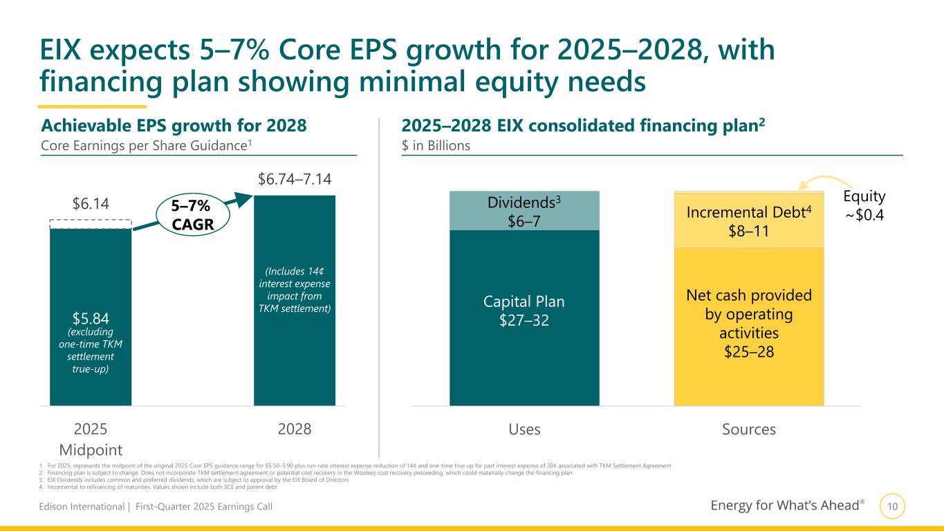 9Edison International | First-Quarter 2025 Earnings Call Reaffirmed 2025 Core EPS guidance of $5.94–6.34 Component Modeling Considerations Rate Base EPS (based on capex levels) 6.60–6.80 • CPUC ROE of 10.33% and FERC ROE 10.30% • Reflects reduction in 2025 ROE from Cost of Capital Phase 2 decision SCE Op. Variance 1.05–1.25 • AFUDC is the largest contributor: ~40¢ • Includes ~30¢ one-time true-up for past TKM interest expense • Timing of regulatory decisions and other variances (including financing) from authorized SCE Costs Excluded from Authorized (0.85)–(0.75) • Primarily wildfire claims payment-related debt • Reflects interest expense reduction associated with TKM settlement • No refinancings or additional issuances remaining as part of 2025 financing plan EIX Parent & Other (0.88)–(0.93) • No refinancings or additional issuances remaining as part of 2025 financing plan 2025 Core Earnings per Share Component Ranges Includes 44¢ (30¢ true-up + 14¢ interest reduction) from TKM settlement