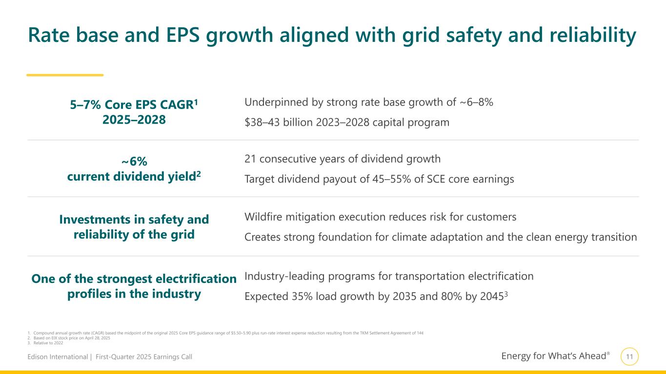 10Edison International | First-Quarter 2025 Earnings Call EIX expects 5–7% Core EPS growth for 2025–2028, with financing plan showing minimal equity needs 1. For 2025, represents the midpoint of the original 2025 Core EPS guidance range for $5.50–5.90 plus run-rate interest expense reduction of 14¢ and one-time true up for past interest expense of 30¢ associated with TKM Settlement Agreement 2. Financing plan is subject to change. Does not incorporate TKM settlement agreement or potential cost recovery in the Woolsey cost recovery proceeding, which could materially change the financing plan 3. EIX Dividends includes common and preferred dividends, which are subject to approval by the EIX Board of Directors 4. Incremental to refinancing of maturities. Values shown include both SCE and parent debt $5.84 $6.14 $6.74–7.14 2025 Midpoint 2028 Achievable EPS growth for 2028 Core Earnings per Share Guidance1 5–7% CAGR Uses Sources 2025–2028 EIX consolidated financing plan2 $ in Billions Capital Plan $27–32 Dividends3 $6–7 Net cash provided by operating activities $25–28 Incremental Debt4 $8–11 Equity ~$0.4 (excluding one-time TKM settlement true-up) (Includes 14¢ interest expense impact from TKM settlement)