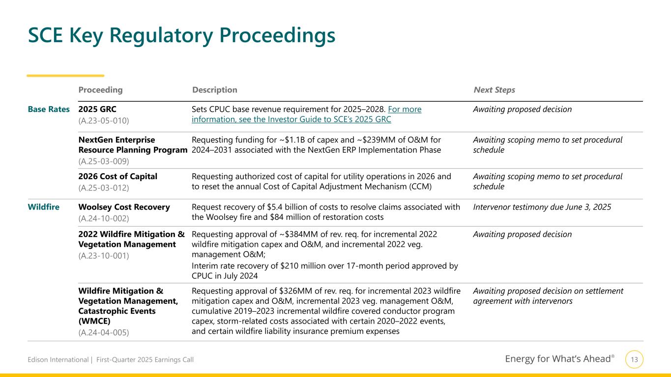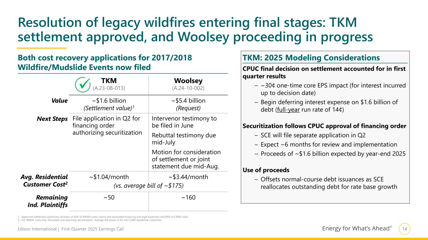 13Edison International | First-Quarter 2025 Earnings Call SCE Key Regulatory Proceedings Proceeding Description Next Steps Base Rates 2025 GRC (A.23-05-010) Sets CPUC base revenue requirement for 2025–2028. For more information, see the Investor Guide to SCE’s 2025 GRC Awaiting proposed decision NextGen Enterprise Resource Planning Program (A.25-03-009) Requesting funding for ~$1.1B of capex and ~$239MM of O&M for 2024–2031 associated with the NextGen ERP Implementation Phase Awaiting scoping memo to set procedural schedule 2026 Cost of Capital (A.25-03-012) Requesting authorized cost of capital for utility operations in 2026 and to reset the annual Cost of Capital Adjustment Mechanism (CCM) Awaiting scoping memo to set procedural schedule Wildfire Woolsey Cost Recovery (A.24-10-002) Request recovery of $5.4 billion of costs to resolve claims associated with the Woolsey fire and $84 million of restoration costs Intervenor testimony due June 3, 2025 2022 Wildfire Mitigation & Vegetation Management (A.23-10-001) Requesting approval of ~$384MM of rev. req. for incremental 2022 wildfire mitigation capex and O&M, and incremental 2022 veg. management O&M; Interim rate recovery of $210 million over 17-month period approved by CPUC in July 2024 Awaiting proposed decision Wildfire Mitigation & Vegetation Management, Catastrophic Events (WMCE) (A.24-04-005) Requesting approval of $326MM of rev. req. for incremental 2023 wildfire mitigation capex and O&M, incremental 2023 veg. management O&M, cumulative 2019–2023 incremental wildfire covered conductor program capex, storm-related costs associated with certain 2020–2022 events, and certain wildfire liability insurance premium expenses Awaiting proposed decision on settlement agreement with intervenors