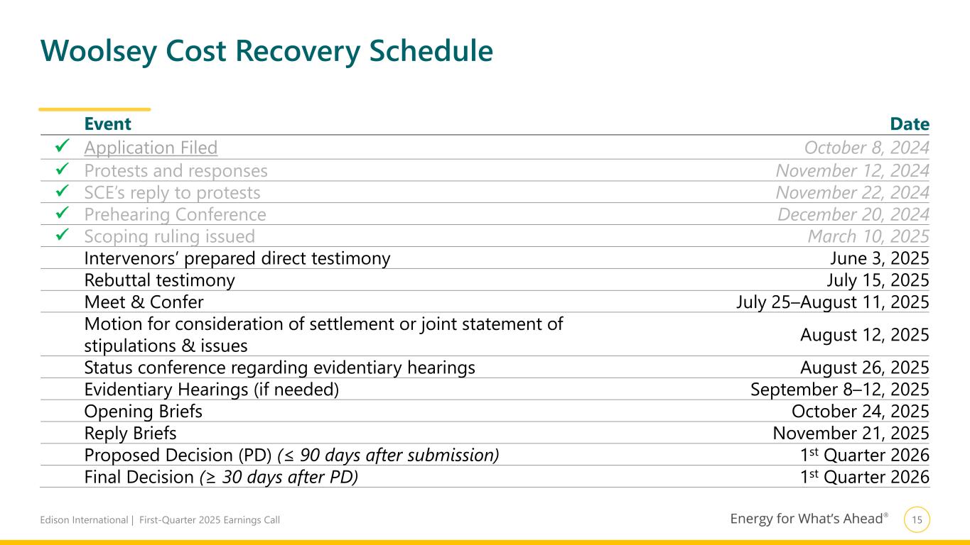 14Edison International | First-Quarter 2025 Earnings Call Resolution of legacy wildfires entering final stages: TKM settlement approved, and Woolsey proceeding in progress TKM (A.23-08-013) Woolsey (A.24-10-002) Value ~$1.6 billion (Settlement value)1 ~$5.4 billion (Request) Next Steps File application in Q2 for financing order authorizing securitization Intervenor testimony to be filed in June Rebuttal testimony due mid-July Motion for consideration of settlement or joint statement due mid-Aug. Avg. Residential Customer Cost2 ~$1.04/month ~$3.44/month (vs. average bill of ~$175) Remaining Ind. Plaintiffs ~50 ~160 TKM: 2025 Modeling ConsiderationsBoth cost recovery applications for 2017/2018 Wildfire/Mudslide Events now filed 1. Approved settlement authorizes recovery of 60% of WEMA costs (claims and associated financing and legal expenses) and 85% of CEMA costs 2. For WEMA costs only. Estimated cost assuming securitization. Average bill shown is for non-CARE residential customers CPUC final decision on settlement accounted for in first quarter results – ~30¢ one-time core EPS impact (for interest incurred up to decision date) – Begin deferring interest expense on $1.6 billion of debt (full-year run rate of 14¢) Securitization follows CPUC approval of financing order – SCE will file separate application in Q2 – Expect ~6 months for review and implementation – Proceeds of ~$1.6 billion expected by year-end 2025 Use of proceeds – Offsets normal-course debt issuances as SCE reallocates outstanding debt for rate base growth 