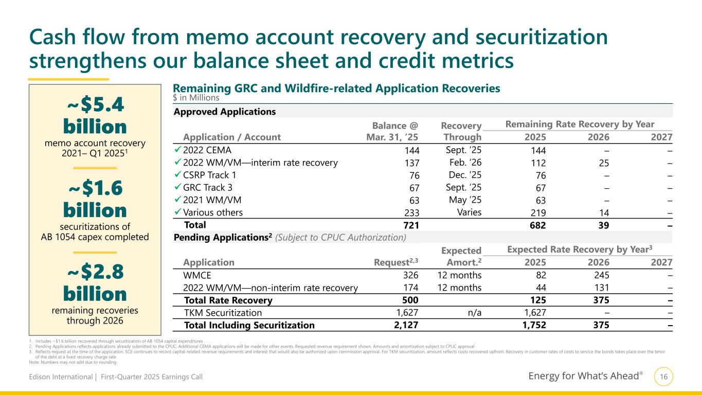 15Edison International | First-Quarter 2025 Earnings Call Woolsey Cost Recovery Schedule Event Date  Application Filed October 8, 2024  Protests and responses November 12, 2024  SCE’s reply to protests November 22, 2024  Prehearing Conference December 20, 2024  Scoping ruling issued March 10, 2025 Intervenors’ prepared direct testimony June 3, 2025 Rebuttal testimony July 15, 2025 Meet & Confer July 25–August 11, 2025 Motion for consideration of settlement or joint statement of stipulations & issues August 12, 2025 Status conference regarding evidentiary hearings August 26, 2025 Evidentiary Hearings (if needed) September 8–12, 2025 Opening Briefs October 24, 2025 Reply Briefs November 21, 2025 Proposed Decision (PD) (≤ 90 days after submission) 1st Quarter 2026 Final Decision (≥ 30 days after PD) 1st Quarter 2026