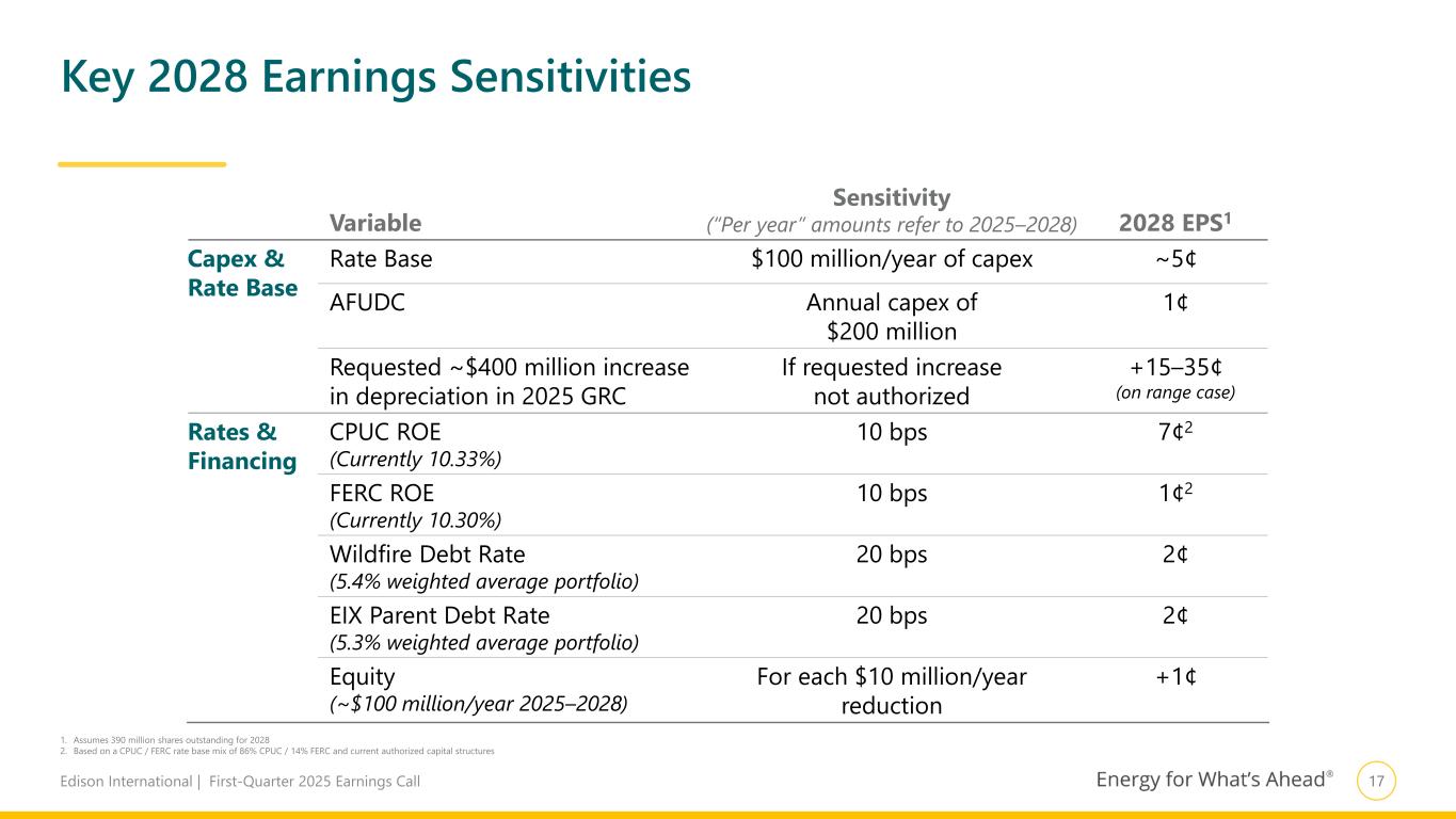 16Edison International | First-Quarter 2025 Earnings Call ~$5.4 billion memo account recovery 2021– Q1 20251 ~$1.6 billion securitizations of AB 1054 capex completed ~$2.8 billion remaining recoveries through 2026 Cash flow from memo account recovery and securitization strengthens our balance sheet and credit metrics Approved Applications Application / Account Balance @ Mar. 31, ’25 Recovery Through Remaining Rate Recovery by Year 2025 2026 2027  2022 CEMA 144 Sept. ’25 144 – –  2022 WM/VM—interim rate recovery 137 Feb. ‘26 112 25 – CSRP Track 1 76 Dec. ’25 76 – – GRC Track 3 67 Sept. ’25 67 – –  2021 WM/VM 63 May ’25 63 – – Various others 233 Varies 219 14 – Total 721 682 39 – Pending Applications2 (Subject to CPUC Authorization) Application Request2,3 Expected Amort.2 Expected Rate Recovery by Year3 2025 2026 2027 WMCE 326 12 months 82 245 – 2022 WM/VM—non-interim rate recovery 174 12 months 44 131 – Total Rate Recovery 500 125 375 – TKM Securitization 1,627 n/a 1,627 – – Total Including Securitization 2,127 1,752 375 – 1. Includes ~$1.6 billion recovered through securitization of AB 1054 capital expenditures 2. Pending Applications reflects applications already submitted to the CPUC. Additional CEMA applications will be made for other events. Requested revenue requirement shown. Amounts and amortization subject to CPUC approval 3. Reflects request at the time of the application. SCE continues to record capital-related revenue requirements and interest that would also be authorized upon commission approval. For TKM securitization, amount reflects costs recovered upfront. Recovery in customer rates of costs to service the bonds takes place over the tenor of the debt at a fixed recovery charge rate Note: Numbers may not add due to rounding Remaining GRC and Wildfire-related Application Recoveries $ in Millions