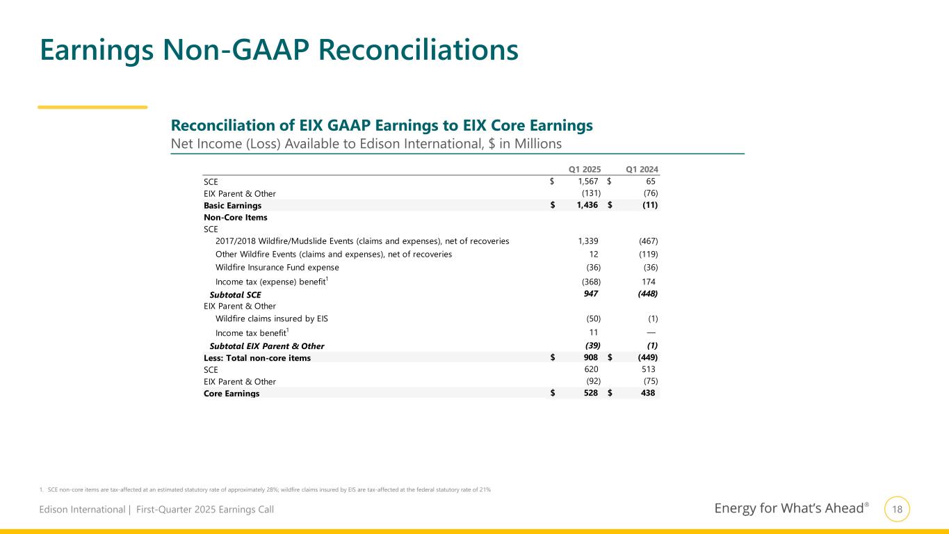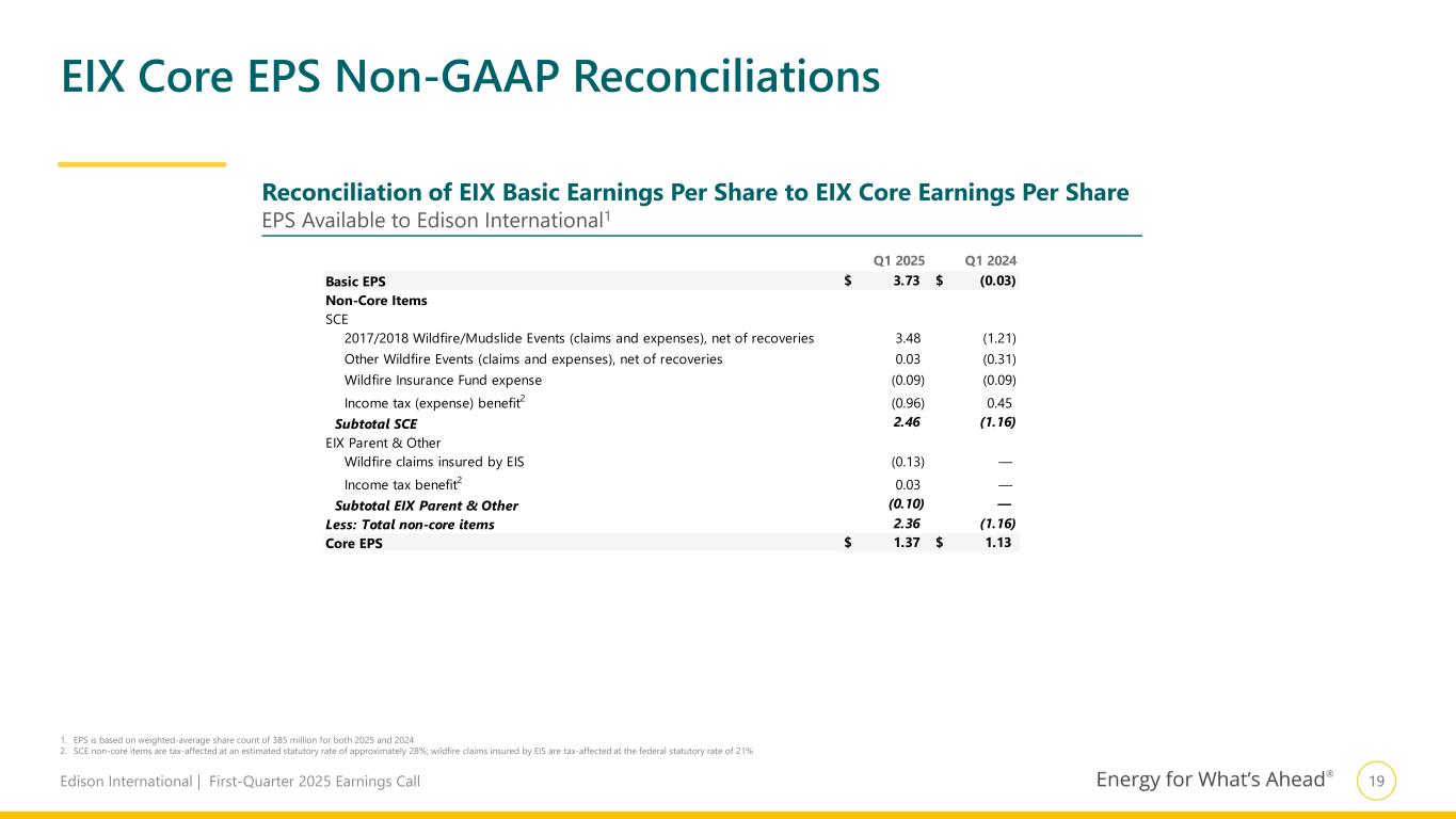 18Edison International | First-Quarter 2025 Earnings Call Q1 2025 Q1 2024 SCE 1,567$ 65$ EIX Parent & Other (131) (76) Basic Earnings 1,436$ (11)$ Non-Core Items SCE 2017/2018 Wildfire/Mudslide Events (claims and expenses), net of recoveries 1,339 (467) Other Wildfire Events (claims and expenses), net of recoveries 12 (119) Wildfire Insurance Fund expense (36) (36) Income tax (expense) benefit1 (368) 174 Subtotal SCE 947 (448) EIX Parent & Other Wildfire claims insured by EIS (50) (1) Income tax benefit1 11 — Subtotal EIX Parent & Other (39) (1) Less: Total non-core items 908$ (449)$ SCE 620 513 EIX Parent & Other (92) (75) Core Earnings 528$ 438$ Earnings Non-GAAP Reconciliations 1. SCE non-core items are tax-affected at an estimated statutory rate of approximately 28%; wildfire claims insured by EIS are tax-affected at the federal statutory rate of 21% Reconciliation of EIX GAAP Earnings to EIX Core Earnings Net Income (Loss) Available to Edison International, $ in Millions