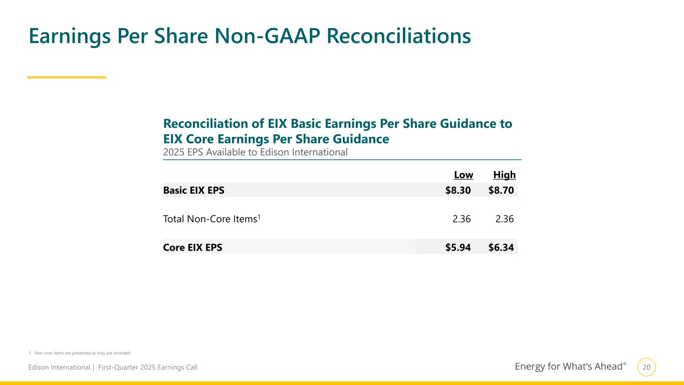 19Edison International | First-Quarter 2025 Earnings Call Q1 2025 Q1 2024 Basic EPS 3.73$ (0.03)$ Non-Core Items SCE 2017/2018 Wildfire/Mudslide Events (claims and expenses), net of recoveries 3.48 (1.21) Other Wildfire Events (claims and expenses), net of recoveries 0.03 (0.31) Wildfire Insurance Fund expense (0.09) (0.09) Income tax (expense) benefit2 (0.96) 0.45 Subtotal SCE 2.46 (1.16) EIX Parent & Other Wildfire claims insured by EIS (0.13) — Income tax benefit2 0.03 — Subtotal EIX Parent & Other (0.10) — Less: Total non-core items 2.36 (1.16) Core EPS 1.37$ 1.13$ EIX Core EPS Non-GAAP Reconciliations 1. EPS is based on weighted-average share count of 385 million for both 2025 and 2024 2. SCE non-core items are tax-affected at an estimated statutory rate of approximately 28%; wildfire claims insured by EIS are tax-affected at the federal statutory rate of 21% Reconciliation of EIX Basic Earnings Per Share to EIX Core Earnings Per Share EPS Available to Edison International1