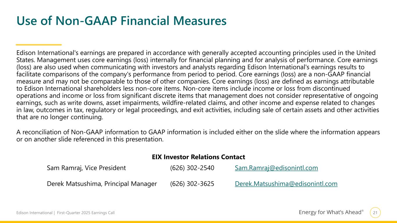 20Edison International | First-Quarter 2025 Earnings Call Low High Basic EIX EPS $8.30 $8.70 Total Non-Core Items1 2.36 2.36 Core EIX EPS $5.94 $6.34 1. Non-core items are presented as they are recorded Earnings Per Share Non-GAAP Reconciliations Reconciliation of EIX Basic Earnings Per Share Guidance to EIX Core Earnings Per Share Guidance 2025 EPS Available to Edison International