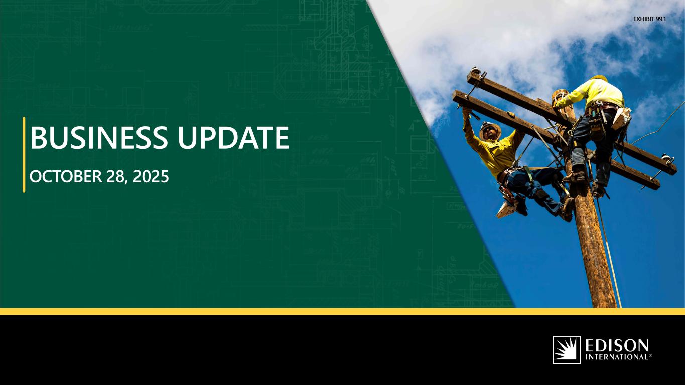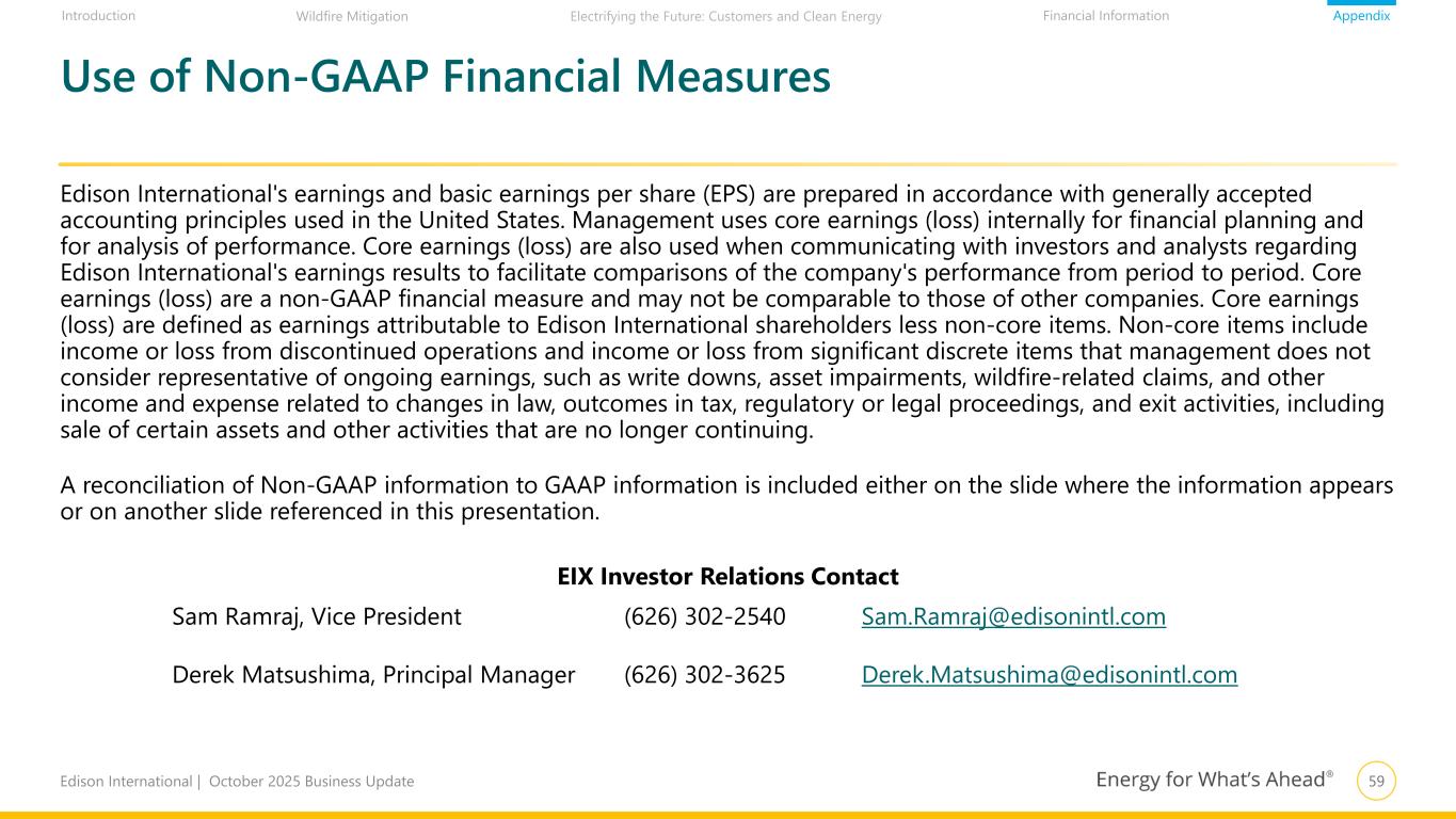 59Edison International | October 2025 Business Update AppendixIntroduction Financial InformationWildfire Mitigation Electrifying the Future: Customers and Clean Energy Use of Non-GAAP Financial Measures EIX Investor Relations Contact Sam Ramraj, Vice President Derek Matsushima, Principal Manager (626) 302-2540 (626) 302-3625 Sam.Ramraj@edisonintl.com Derek.Matsushima@edisonintl.com Edison International's earnings and basic earnings per share (EPS) are prepared in accordance with generally accepted accounting principles used in the United States. Management uses core earnings (loss) internally for financial planning and for analysis of performance. Core earnings (loss) are also used when communicating with investors and analysts regarding Edison International's earnings results to facilitate comparisons of the company's performance from period to period. Core earnings (loss) are a non-GAAP financial measure and may not be comparable to those of other companies. Core earnings (loss) are defined as earnings attributable to Edison International shareholders less non-core items. Non-core items include income or loss from discontinued operations and income or loss from significant discrete items that management does not consider representative of ongoing earnings, such as write downs, asset impairments, wildfire-related claims, and other income and expense related to changes in law, outcomes in tax, regulatory or legal proceedings, and exit activities, including sale of certain assets and other activities that are no longer continuing. A reconciliation of Non-GAAP information to GAAP information is included either on the slide where the information appears or on another slide referenced in this presentation.
