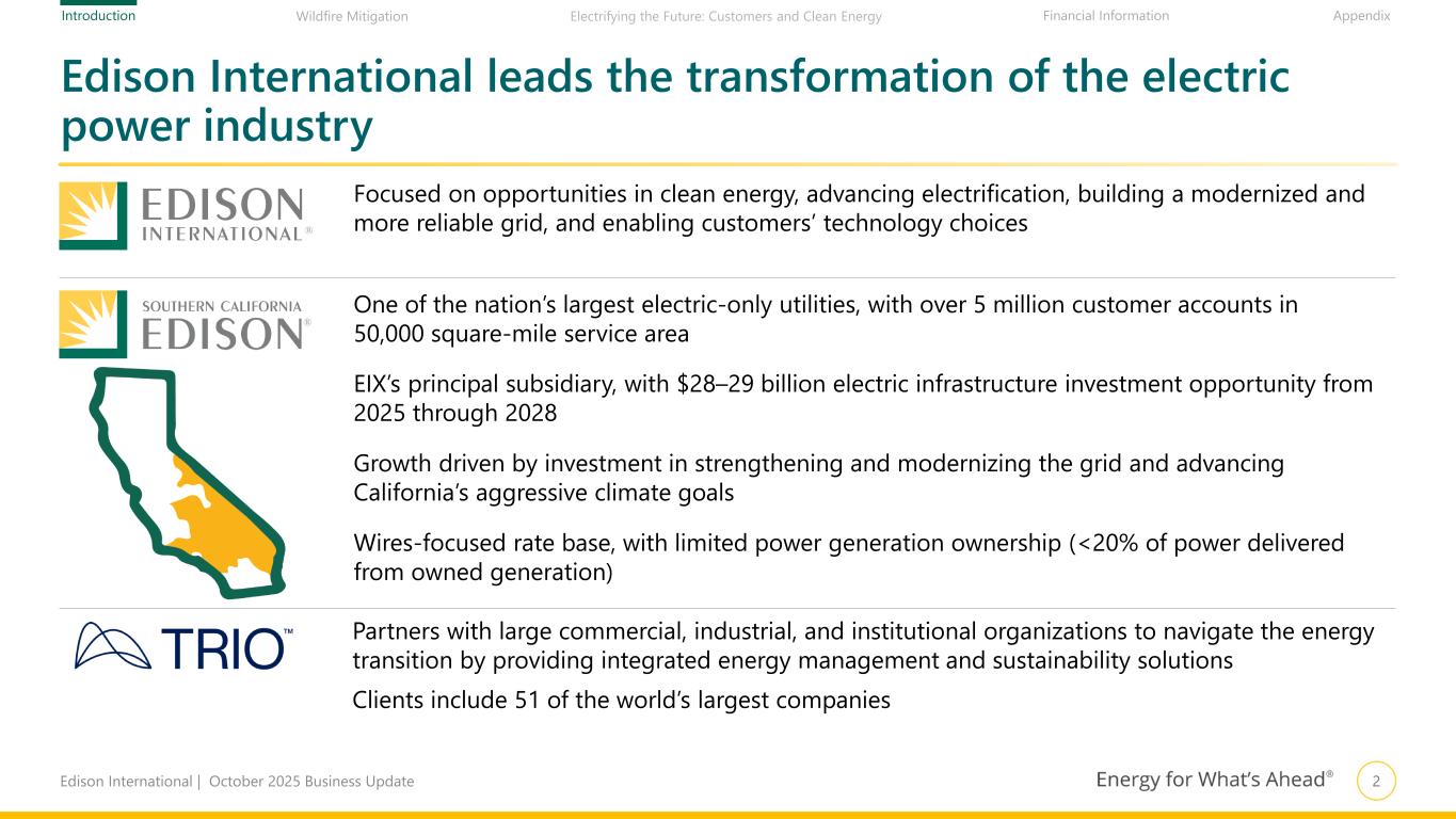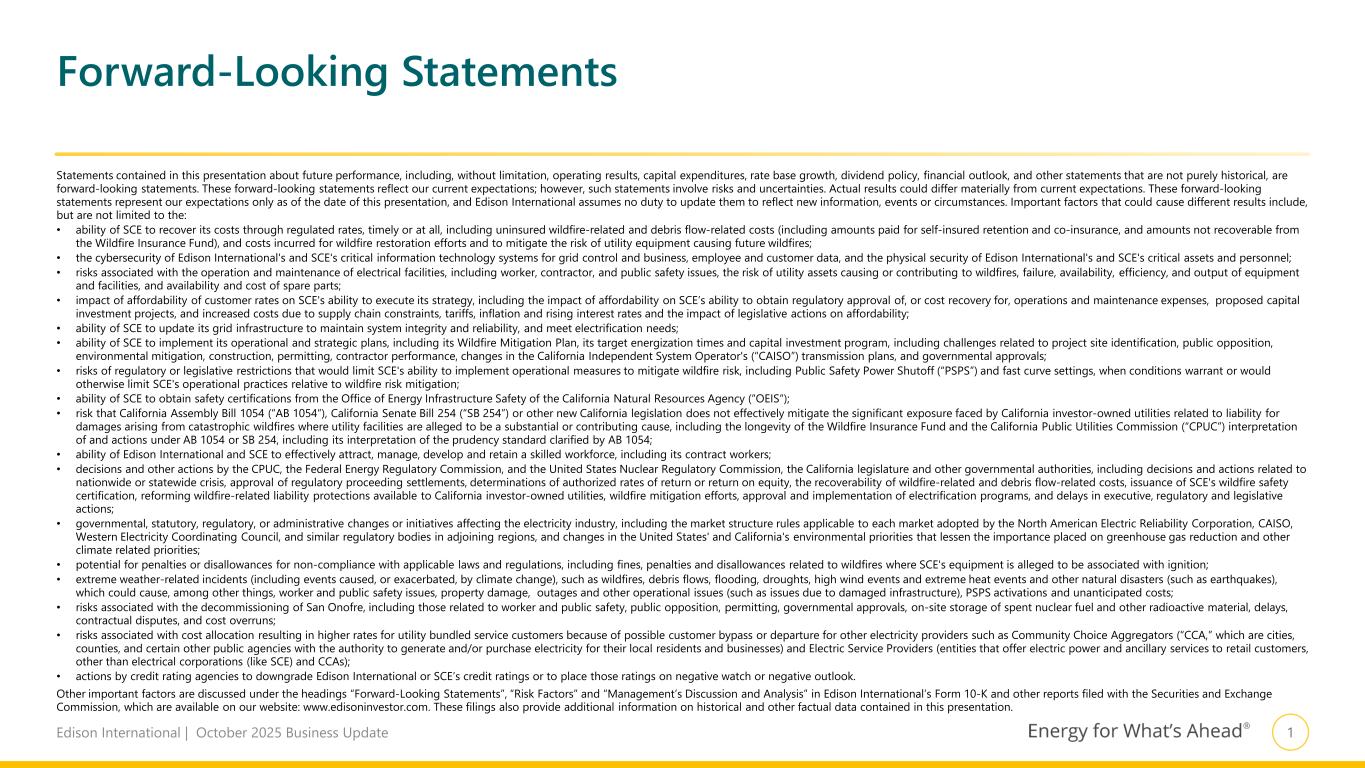 1Edison International | October 2025 Business Update Statements contained in this presentation about future performance, including, without limitation, operating results, capital expenditures, rate base growth, dividend policy, financial outlook, and other statements that are not purely historical, are forward-looking statements. These forward-looking statements reflect our current expectations; however, such statements involve risks and uncertainties. Actual results could differ materially from current expectations. These forward-looking statements represent our expectations only as of the date of this presentation, and Edison International assumes no duty to update them to reflect new information, events or circumstances. Important factors that could cause different results include, but are not limited to the: • ability of SCE to recover its costs through regulated rates, timely or at all, including uninsured wildfire-related and debris flow-related costs (including amounts paid for self-insured retention and co-insurance, and amounts not recoverable from the Wildfire Insurance Fund), and costs incurred for wildfire restoration efforts and to mitigate the risk of utility equipment causing future wildfires; • the cybersecurity of Edison International's and SCE's critical information technology systems for grid control and business, employee and customer data, and the physical security of Edison International's and SCE's critical assets and personnel; • risks associated with the operation and maintenance of electrical facilities, including worker, contractor, and public safety issues, the risk of utility assets causing or contributing to wildfires, failure, availability, efficiency, and output of equipment and facilities, and availability and cost of spare parts; • impact of affordability of customer rates on SCE's ability to execute its strategy, including the impact of affordability on SCE’s ability to obtain regulatory approval of, or cost recovery for, operations and maintenance expenses, proposed capital investment projects, and increased costs due to supply chain constraints, tariffs, inflation and rising interest rates and the impact of legislative actions on affordability; • ability of SCE to update its grid infrastructure to maintain system integrity and reliability, and meet electrification needs; • ability of SCE to implement its operational and strategic plans, including its Wildfire Mitigation Plan, its target energization times and capital investment program, including challenges related to project site identification, public opposition, environmental mitigation, construction, permitting, contractor performance, changes in the California Independent System Operator's (“CAISO”) transmission plans, and governmental approvals; • risks of regulatory or legislative restrictions that would limit SCE's ability to implement operational measures to mitigate wildfire risk, including Public Safety Power Shutoff (“PSPS”) and fast curve settings, when conditions warrant or would otherwise limit SCE's operational practices relative to wildfire risk mitigation; • ability of SCE to obtain safety certifications from the Office of Energy Infrastructure Safety of the California Natural Resources Agency (“OEIS“); • risk that California Assembly Bill 1054 (“AB 1054“), California Senate Bill 254 (“SB 254”) or other new California legislation does not effectively mitigate the significant exposure faced by California investor-owned utilities related to liability for damages arising from catastrophic wildfires where utility facilities are alleged to be a substantial or contributing cause, including the longevity of the Wildfire Insurance Fund and the California Public Utilities Commission (“CPUC”) interpretation of and actions under AB 1054 or SB 254, including its interpretation of the prudency standard clarified by AB 1054; • ability of Edison International and SCE to effectively attract, manage, develop and retain a skilled workforce, including its contract workers; • decisions and other actions by the CPUC, the Federal Energy Regulatory Commission, and the United States Nuclear Regulatory Commission, the California legislature and other governmental authorities, including decisions and actions related to nationwide or statewide crisis, approval of regulatory proceeding settlements, determinations of authorized rates of return or return on equity, the recoverability of wildfire-related and debris flow-related costs, issuance of SCE's wildfire safety certification, reforming wildfire-related liability protections available to California investor-owned utilities, wildfire mitigation efforts, approval and implementation of electrification programs, and delays in executive, regulatory and legislative actions; • governmental, statutory, regulatory, or administrative changes or initiatives affecting the electricity industry, including the market structure rules applicable to each market adopted by the North American Electric Reliability Corporation, CAISO, Western Electricity Coordinating Council, and similar regulatory bodies in adjoining regions, and changes in the United States' and California's environmental priorities that lessen the importance placed on greenhouse gas reduction and other climate related priorities; • potential for penalties or disallowances for non-compliance with applicable laws and regulations, including fines, penalties and disallowances related to wildfires where SCE's equipment is alleged to be associated with ignition; • extreme weather-related incidents (including events caused, or exacerbated, by climate change), such as wildfires, debris flows, flooding, droughts, high wind events and extreme heat events and other natural disasters (such as earthquakes), which could cause, among other things, worker and public safety issues, property damage, outages and other operational issues (such as issues due to damaged infrastr