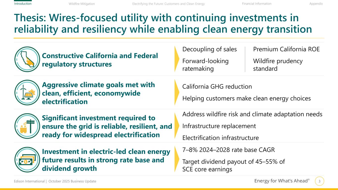 2Edison International | October 2025 Business Update Wildfire Mitigation Financial Information AppendixIntroduction Electrifying the Future: Customers and Clean Energy Edison International leads the transformation of the electric power industry One of the nation’s largest electric-only utilities, with over 5 million customer accounts in 50,000 square-mile service area EIX’s principal subsidiary, with $28–29 billion electric infrastructure investment opportunity from 2025 through 2028 Growth driven by investment in strengthening and modernizing the grid and advancing California’s aggressive climate goals Wires-focused rate base, with limited power generation ownership (<20% of power delivered from owned generation) Partners with large commercial, industrial, and institutional organizations to navigate the energy transition by providing integrated energy management and sustainability solutions Clients include 51 of the world’s largest companies Focused on opportunities in clean energy, advancing electrification, building a modernized and more reliable grid, and enabling customers’ technology choices