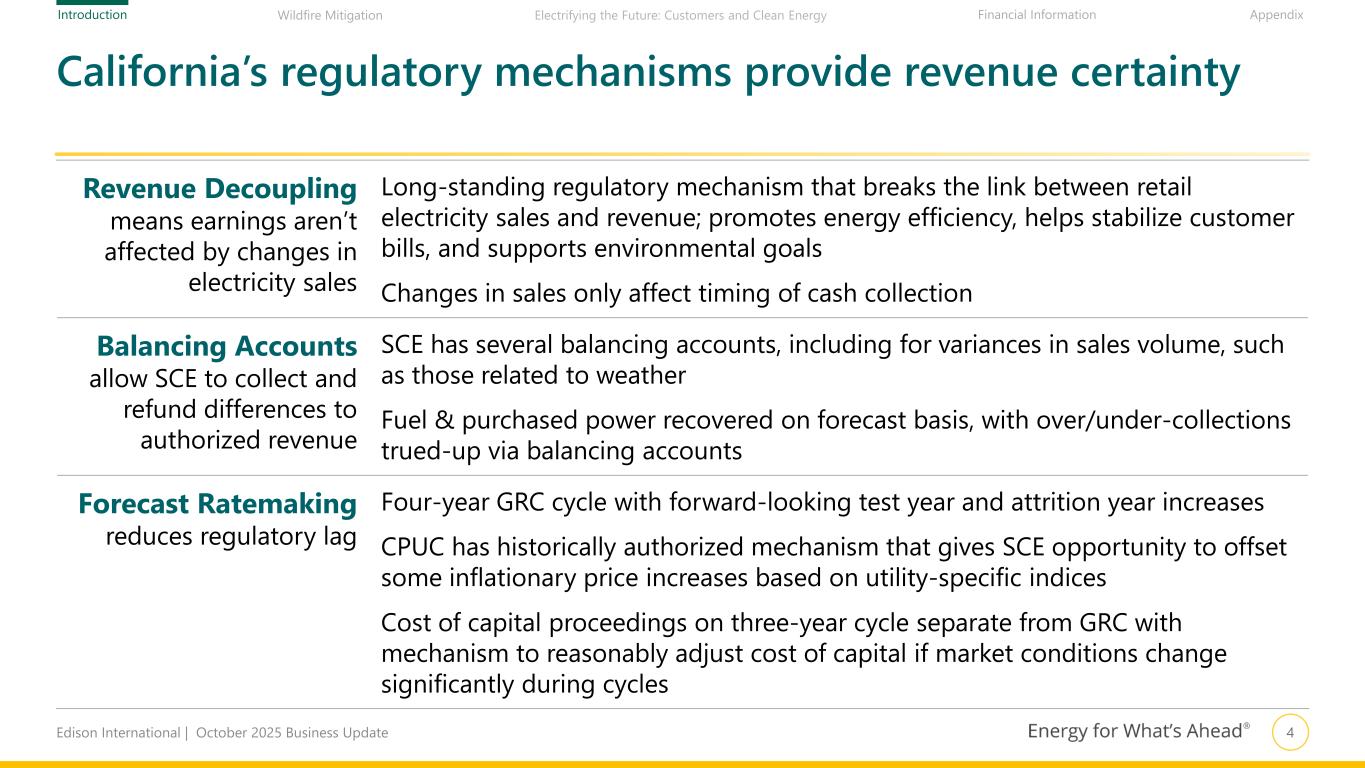 4Edison International | October 2025 Business Update Wildfire Mitigation Financial Information AppendixIntroduction Electrifying the Future: Customers and Clean Energy California’s regulatory mechanisms provide revenue certainty Revenue Decoupling means earnings aren’t affected by changes in electricity sales Long-standing regulatory mechanism that breaks the link between retail electricity sales and revenue; promotes energy efficiency, helps stabilize customer bills, and supports environmental goals Changes in sales only affect timing of cash collection Balancing Accounts allow SCE to collect and refund differences to authorized revenue SCE has several balancing accounts, including for variances in sales volume, such as those related to weather Fuel & purchased power recovered on forecast basis, with over/under-collections trued-up via balancing accounts Forecast Ratemaking reduces regulatory lag Four-year GRC cycle with forward-looking test year and attrition year increases CPUC has historically authorized mechanism that gives SCE opportunity to offset some inflationary price increases based on utility-specific indices Cost of capital proceedings on three-year cycle separate from GRC with mechanism to reasonably adjust cost of capital if market conditions change significantly during cycles
