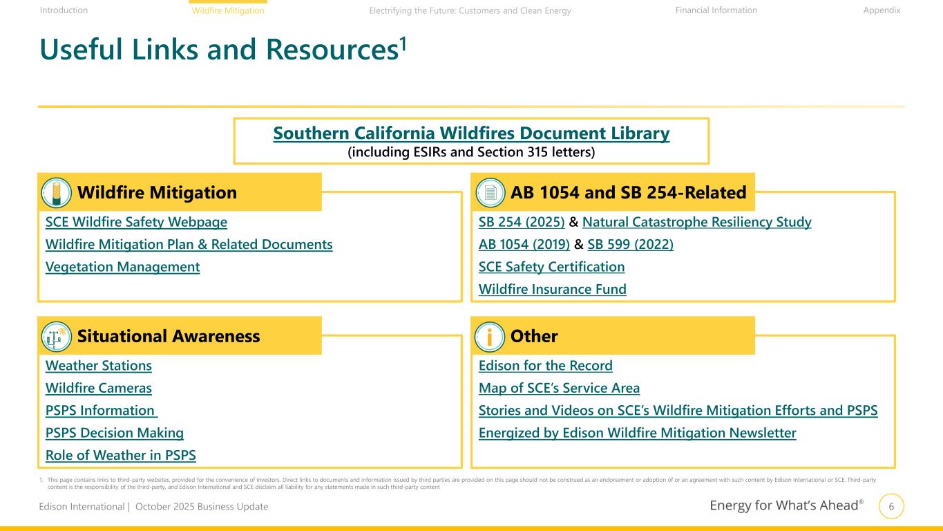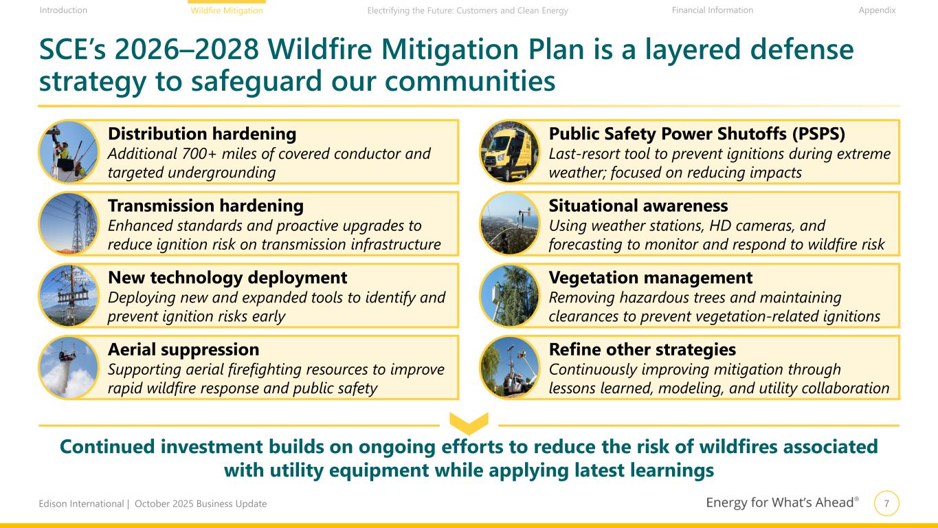 6Edison International | October 2025 Business Update Financial Information AppendixIntroduction Wildfire Mitigation Electrifying the Future: Customers and Clean Energy SB 254 (2025) & Natural Catastrophe Resiliency Study AB 1054 (2019) & SB 599 (2022) SCE Safety Certification Wildfire Insurance Fund AB 1054 and SB 254-Related Edison for the Record Map of SCE’s Service Area Stories and Videos on SCE’s Wildfire Mitigation Efforts and PSPS Energized by Edison Wildfire Mitigation Newsletter Other Useful Links and Resources1 Weather Stations Wildfire Cameras PSPS Information PSPS Decision Making Role of Weather in PSPS SCE Wildfire Safety Webpage Wildfire Mitigation Plan & Related Documents Vegetation Management Southern California Wildfires Document Library (including ESIRs and Section 315 letters) Situational Awareness Wildfire Mitigation 1. This page contains links to third-party websites, provided for the convenience of investors. Direct links to documents and information issued by third parties are provided on this page should not be construed as an endorsement or adoption of or an agreement with such content by Edison International or SCE. Third-party content is the responsibility of the third-party, and Edison International and SCE disclaim all liability for any statements made in such third-party content