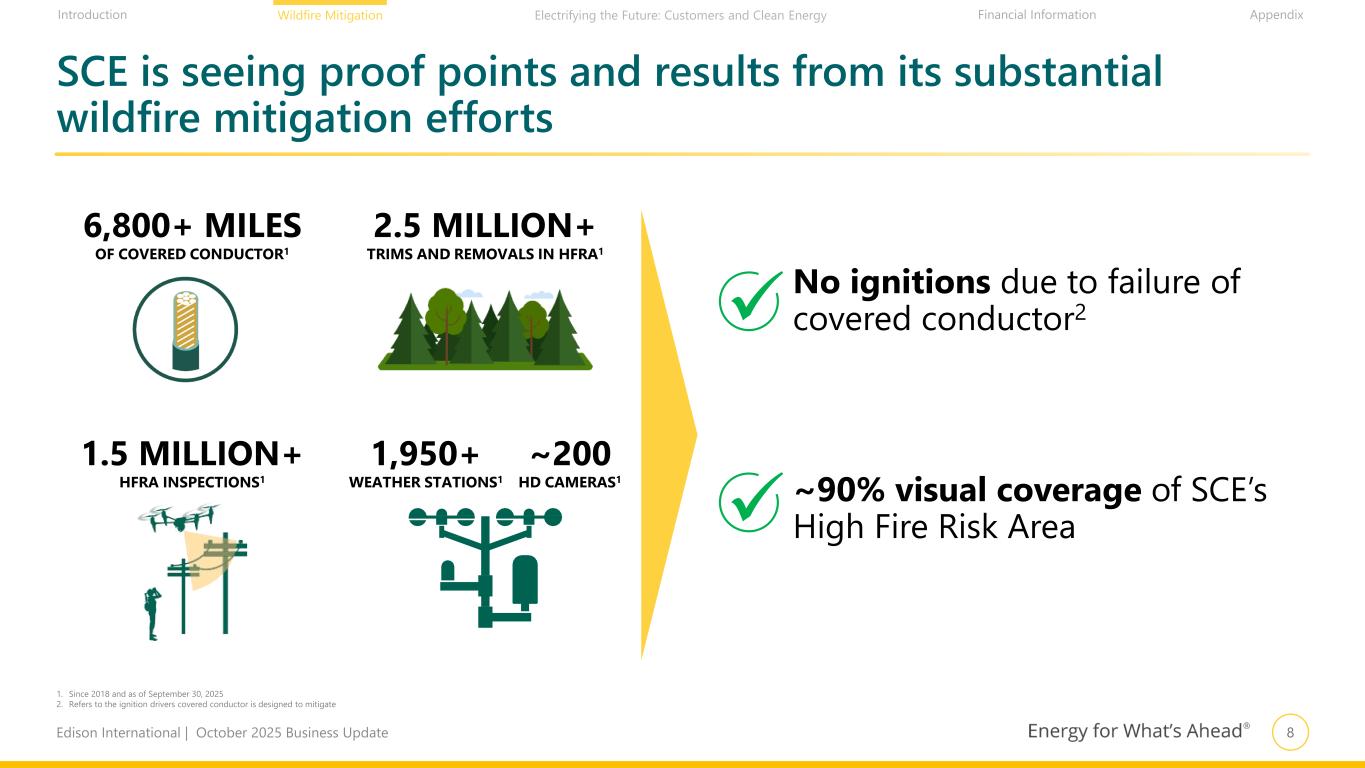 7Edison International | October 2025 Business Update Financial Information AppendixIntroduction Wildfire Mitigation Electrifying the Future: Customers and Clean Energy SCE’s 2026–2028 Wildfire Mitigation Plan is a layered defense strategy to safeguard our communities Distribution hardening Additional 700+ miles of covered conductor and targeted undergrounding Transmission hardening Enhanced standards and proactive upgrades to reduce ignition risk on transmission infrastructure New technology deployment Deploying new and expanded tools to identify and prevent ignition risks early Public Safety Power Shutoffs (PSPS) Last-resort tool to prevent ignitions during extreme weather; focused on reducing impacts Situational awareness Using weather stations, HD cameras, and forecasting to monitor and respond to wildfire risk Continued investment builds on ongoing efforts to reduce the risk of wildfires associated with utility equipment while applying latest learnings Vegetation management Removing hazardous trees and maintaining clearances to prevent vegetation-related ignitions Aerial suppression Supporting aerial firefighting resources to improve rapid wildfire response and public safety Refine other strategies Continuously improving mitigation through lessons learned, modeling, and utility collaboration