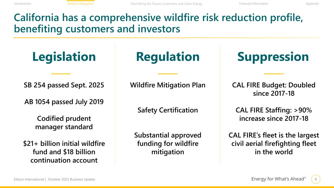 8Edison International | October 2025 Business Update Financial Information AppendixIntroduction Wildfire Mitigation Electrifying the Future: Customers and Clean Energy SCE is seeing proof points and results from its substantial wildfire mitigation efforts 1. Since 2018 and as of September 30, 2025 2. Refers to the ignition drivers covered conductor is designed to mitigate 6,800+ MILES OF COVERED CONDUCTOR1 2.5 MILLION+ TRIMS AND REMOVALS IN HFRA1 1.5 MILLION+ HFRA INSPECTIONS1 1,950+ WEATHER STATIONS1 ~200 HD CAMERAS1 No ignitions due to failure of covered conductor2 ~90% visual coverage of SCE’s High Fire Risk Area