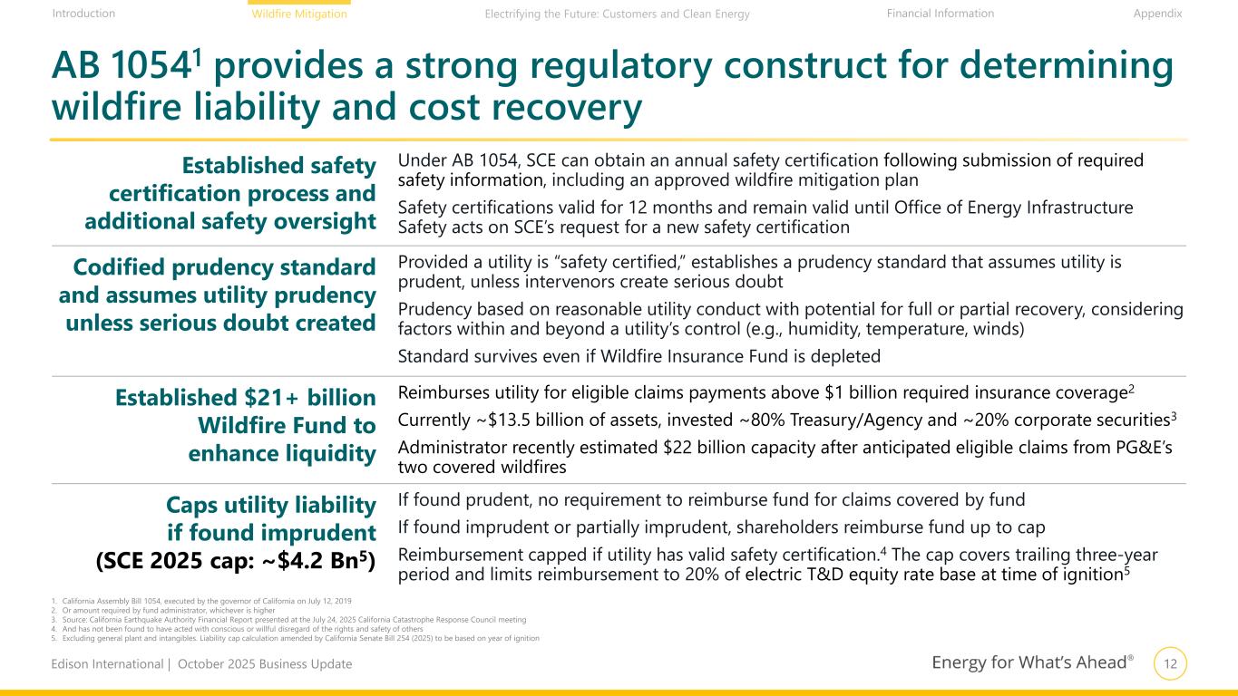 11Edison International | October 2025 Business Update Financial Information AppendixIntroduction Wildfire Mitigation Electrifying the Future: Customers and Clean Energy …and requires evaluation of broad long-term reforms, recognizing new models necessary to equitably socialize risk Recognizes climate-driven natural catastrophe costs exceed what customers or shareholders can bear Broad reforms across numerous sectors and stakeholders needed in response to emerging climate- fueled economic crisis Solutions should ensure IOUs are accountable for safety and also have the financial health to attract low- cost capital on behalf of customers CEA to perform comprehensive assessment on new models or approaches The CEA’s report, due to the Legislature and Governor by April 1, 2026, shall include specific recommendations, including, but not limited to: Reduction of Wildfire Risk and Damage Ensuring Fair Compensation Equitable Risk Socialization • Additional wildfire mitigation measures and technology solutions to reduce risk of ignition and limit spread and damage • Options for enactment of programs to reduce the risk of wildfires spreading and becoming high-severity catastrophes • Options for reducing economic damage resulting from wildfires and potentially other catastrophic natural disasters • Financing, insurance, and other mechanisms to expedite recovery for communities impacted by natural catastrophes • Options for enactment of streamlined, low-cost mechanism to provide injured parties full compensation for damages resulting from wildfires • Impacts of reasonable limitations on changes to recoveries in wildfire litigation arising from ignitions caused by utility infrastructure • Accessibility and affordability of property insurance in California • Alternative structures to socialize risk of damage from natural catastrophes • Additional measures to benefit ratepayers through reducing costs caused by fiscal uncertainty while holding IOUs accountable for improving safety and reducing risk • Options for new models to complement or replace the fund