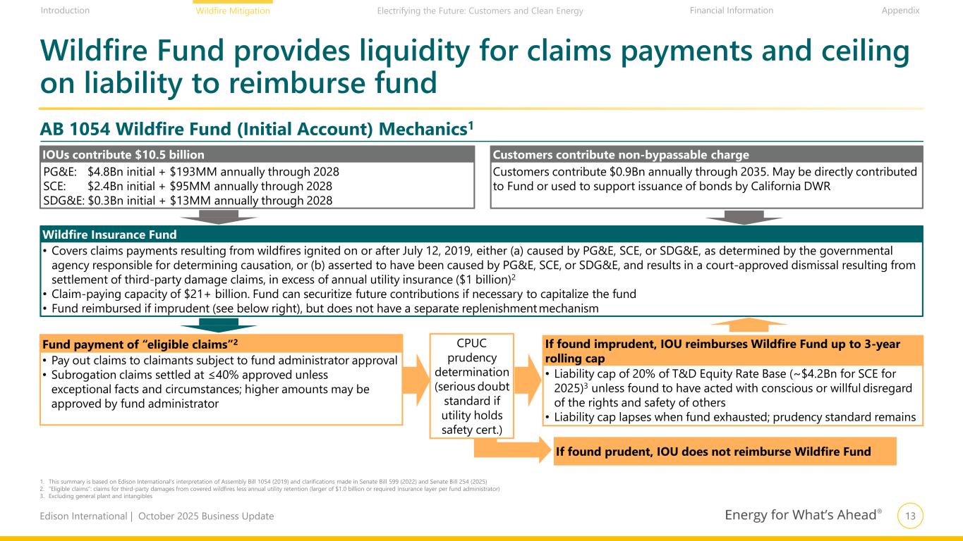12Edison International | October 2025 Business Update Financial Information AppendixIntroduction Wildfire Mitigation Electrifying the Future: Customers and Clean Energy AB 10541 provides a strong regulatory construct for determining wildfire liability and cost recovery Established safety certification process and additional safety oversight Under AB 1054, SCE can obtain an annual safety certification following submission of required safety information, including an approved wildfire mitigation plan Safety certifications valid for 12 months and remain valid until Office of Energy Infrastructure Safety acts on SCE’s request for a new safety certification Codified prudency standard and assumes utility prudency unless serious doubt created Provided a utility is “safety certified,” establishes a prudency standard that assumes utility is prudent, unless intervenors create serious doubt Prudency based on reasonable utility conduct with potential for full or partial recovery, considering factors within and beyond a utility’s control (e.g., humidity, temperature, winds) Standard survives even if Wildfire Insurance Fund is depleted Established $21+ billion Wildfire Fund to enhance liquidity Reimburses utility for eligible claims payments above $1 billion required insurance coverage2 Currently ~$13.5 billion of assets, invested ~80% Treasury/Agency and ~20% corporate securities3 Administrator recently estimated $22 billion capacity after anticipated eligible claims from PG&E’s two covered wildfires Caps utility liability if found imprudent (SCE 2025 cap: ~$4.2 Bn5) If found prudent, no requirement to reimburse fund for claims covered by fund If found imprudent or partially imprudent, shareholders reimburse fund up to cap Reimbursement capped if utility has valid safety certification.4 The cap covers trailing three-year period and limits reimbursement to 20% of electric T&D equity rate base at time of ignition5 1. California Assembly Bill 1054, executed by the governor of California on July 12, 2019 2. Or amount required by fund administrator, whichever is higher 3. Source: California Earthquake Authority Financial Report presented at the July 24, 2025 California Catastrophe Response Council meeting 4. And has not been found to have acted with conscious or willful disregard of the rights and safety of others 5. Excluding general plant and intangibles. Liability cap calculation amended by California Senate Bill 254 (2025) to be based on year of ignition
