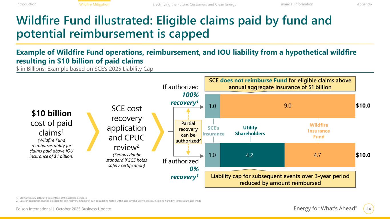 13Edison International | October 2025 Business Update Financial Information AppendixIntroduction Wildfire Mitigation Electrifying the Future: Customers and Clean Energy Wildfire Fund provides liquidity for claims payments and ceiling on liability to reimburse fund AB 1054 Wildfire Fund (Initial Account) Mechanics1 1. This summary is based on Edison International’s interpretation of Assembly Bill 1054 (2019) and clarifications made in Senate Bill 599 (2022) and Senate Bill 254 (2025) 2. “Eligible claims”: claims for third-party damages from covered wildfires less annual utility retention (larger of $1.0 billion or required insurance layer per fund administrator) 3. Excluding general plant and intangibles • Pay out claims to claimants subject to fund administrator approval • Subrogation claims settled at ≤40% approved unless exceptional facts and circumstances; higher amounts may be approved by fund administrator Fund payment of “eligible claims”2 CPUC prudency determination (serious doubt standard if utility holds safety cert.) • Covers claims payments resulting from wildfires ignited on or after July 12, 2019, either (a) caused by PG&E, SCE, or SDG&E, as determined by the governmental agency responsible for determining causation, or (b) asserted to have been caused by PG&E, SCE, or SDG&E, and results in a court-approved dismissal resulting from settlement of third-party damage claims, in excess of annual utility insurance ($1 billion)2 • Claim-paying capacity of $21+ billion. Fund can securitize future contributions if necessary to capitalize the fund • Fund reimbursed if imprudent (see below right), but does not have a separate replenishment mechanism Wildfire Insurance Fund • Liability cap of 20% of T&D Equity Rate Base (~$4.2Bn for SCE for 2025)3 unless found to have acted with conscious or willful disregard of the rights and safety of others • Liability cap lapses when fund exhausted; prudency standard remains If found imprudent, IOU reimburses Wildfire Fund up to 3-year rolling cap If found prudent, IOU does not reimburse Wildfire Fund PG&E: $4.8Bn initial + $193MM annually through 2028 SCE: $2.4Bn initial + $95MM annually through 2028 SDG&E: $0.3Bn initial + $13MM annually through 2028 IOUs contribute $10.5 billion Customers contribute $0.9Bn annually through 2035. May be directly contributed to Fund or used to support issuance of bonds by California DWR Customers contribute non-bypassable charge