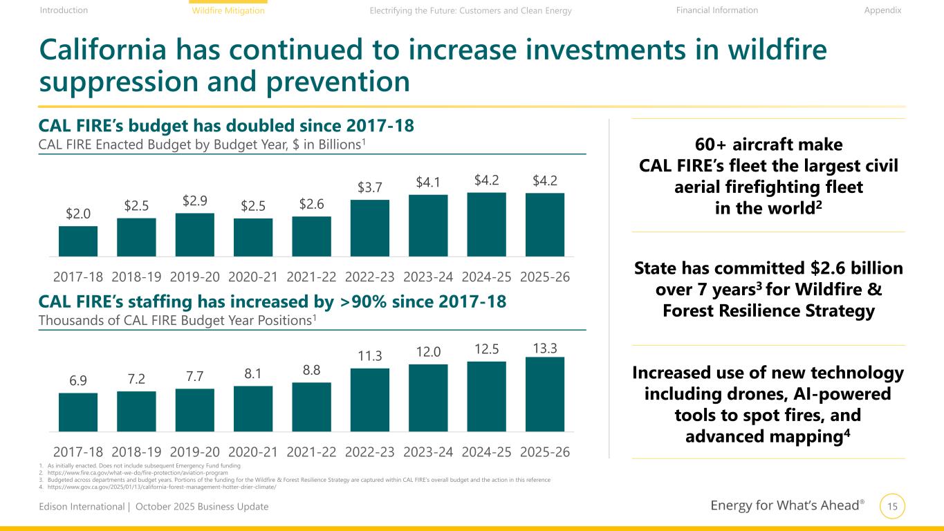 15Edison International | October 2025 Business Update Financial Information AppendixIntroduction Wildfire Mitigation Electrifying the Future: Customers and Clean Energy $2.0 $2.5 $2.9 $2.5 $2.6 $3.7 $4.1 $4.2 $4.2 2017-18 2018-19 2019-20 2020-21 2021-22 2022-23 2023-24 2024-25 2025-26 California has continued to increase investments in wildfire suppression and prevention 60+ aircraft make CAL FIRE’s fleet the largest civil aerial firefighting fleet in the world2 1. As initially enacted. Does not include subsequent Emergency Fund funding 2. https://www.fire.ca.gov/what-we-do/fire-protection/aviation-program 3. Budgeted across departments and budget years. Portions of the funding for the Wildfire & Forest Resilience Strategy are captured within CAL FIRE’s overall budget and the action in this reference 4. https://www.gov.ca.gov/2025/01/13/california-forest-management-hotter-drier-climate/ CAL FIRE’s budget has doubled since 2017-18 CAL FIRE Enacted Budget by Budget Year, $ in Billions1 CAL FIRE’s staffing has increased by >90% since 2017-18 Thousands of CAL FIRE Budget Year Positions1 6.9 7.2 7.7 8.1 8.8 11.3 12.0 12.5 13.3 2017-18 2018-19 2019-20 2020-21 2021-22 2022-23 2023-24 2024-25 2025-26 State has committed $2.6 billion over 7 years3 for Wildfire & Forest Resilience Strategy Increased use of new technology including drones, AI-powered tools to spot fires, and advanced mapping4