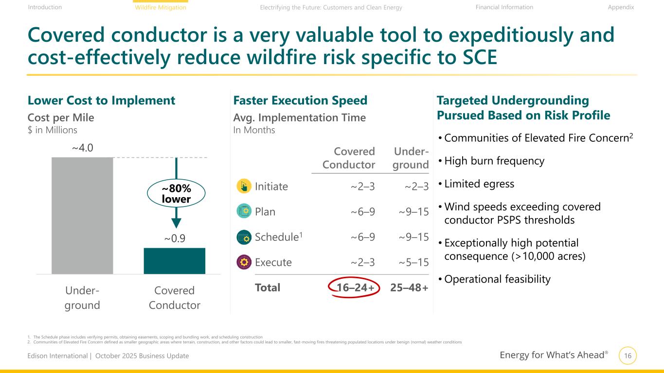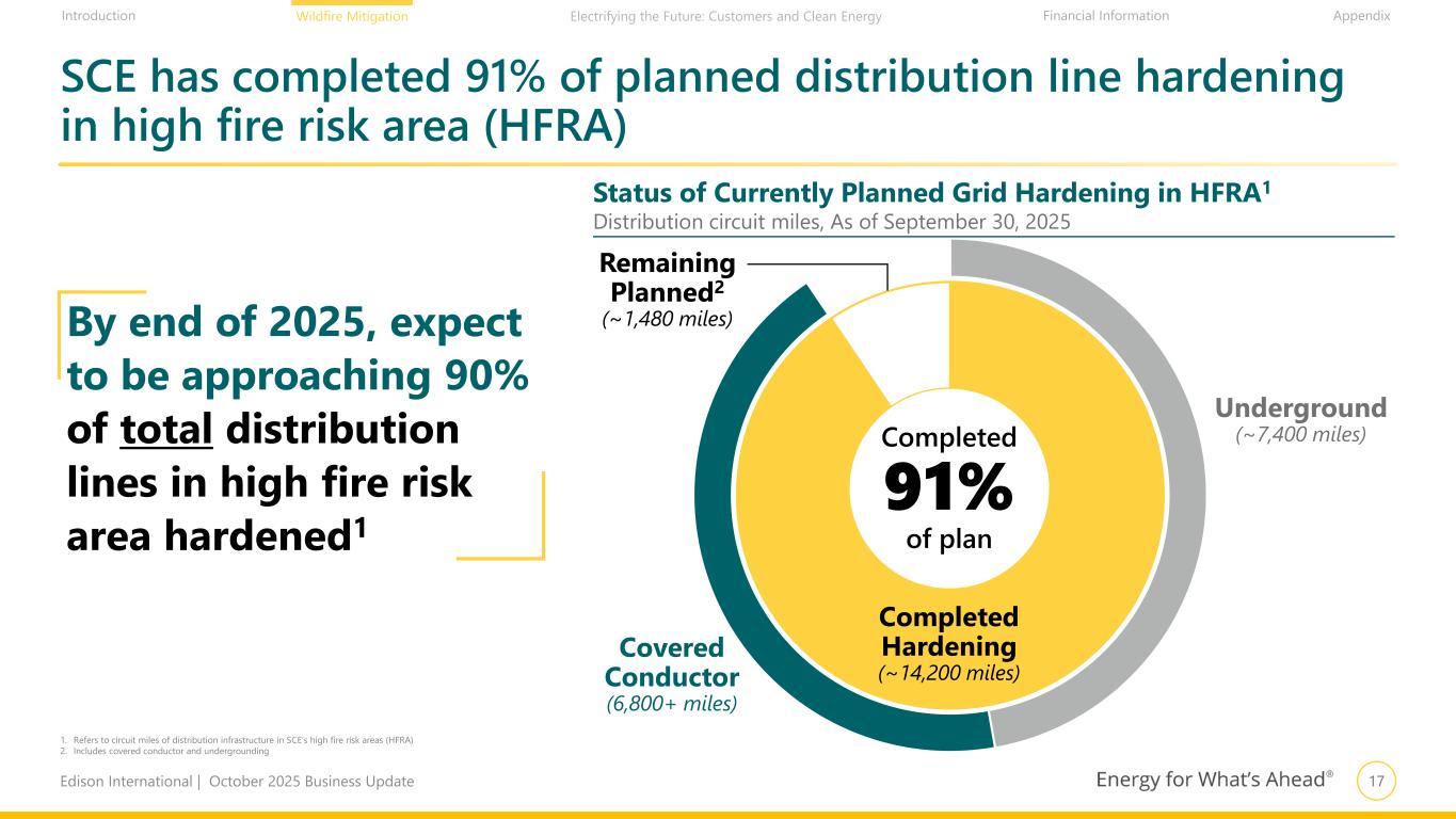 16Edison International | October 2025 Business Update Financial Information AppendixIntroduction Wildfire Mitigation Electrifying the Future: Customers and Clean Energy ~4.0 ~0.9 Under- ground Covered Conductor Covered conductor is a very valuable tool to expeditiously and cost-effectively reduce wildfire risk specific to SCE • Communities of Elevated Fire Concern2 • High burn frequency • Limited egress • Wind speeds exceeding covered conductor PSPS thresholds • Exceptionally high potential consequence (>10,000 acres) • Operational feasibility Cost per Mile $ in Millions Avg. Implementation Time In Months 1. The Schedule phase includes verifying permits, obtaining easements, scoping and bundling work, and scheduling construction 2. Communities of Elevated Fire Concern defined as smaller geographic areas where terrain, construction, and other factors could lead to smaller, fast-moving fires threatening populated locations under benign (normal) weather conditions Targeted Undergrounding Pursued Based on Risk Profile Lower Cost to Implement Faster Execution Speed Covered Conductor Under- ground Initiate ~2–3 ~2–3 Plan ~6–9 ~9–15 Schedule1 ~6–9 ~9–15 Execute ~2–3 ~5–15 Total 16–24+ 25–48+ ~80% lower