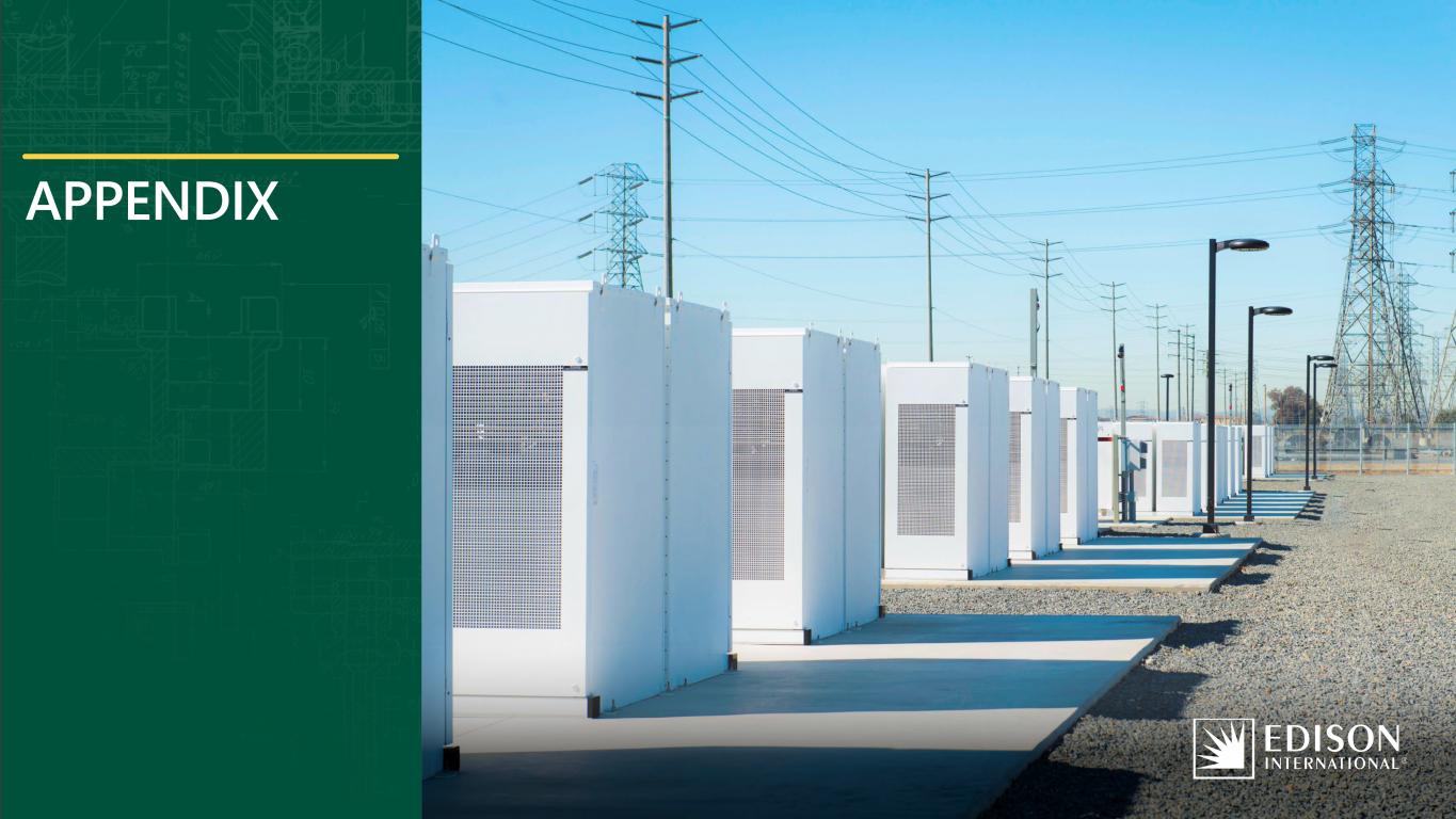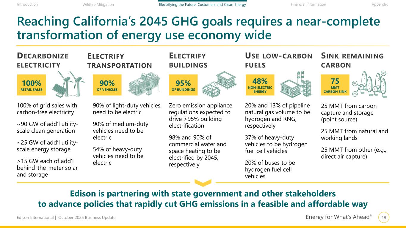 19Edison International | October 2025 Business Update Financial Information AppendixIntroduction Wildfire Mitigation Electrifying the Future: Customers and Clean Energy Reaching California’s 2045 GHG goals requires a near-complete transformation of energy use economy wide 100% of grid sales with carbon-free electricity ~90 GW of add’l utility- scale clean generation ~25 GW of add’l utility- scale energy storage >15 GW each of add’l behind-the-meter solar and storage Zero emission appliance regulations expected to drive >95% building electrification 98% and 90% of commercial water and space heating to be electrified by 2045, respectively 90% of light-duty vehicles need to be electric 90% of medium-duty vehicles need to be electric 54% of heavy-duty vehicles need to be electric 20% and 13% of pipeline natural gas volume to be hydrogen and RNG, respectively 37% of heavy-duty vehicles to be hydrogen fuel cell vehicles 20% of buses to be hydrogen fuel cell vehicles Edison is partnering with state government and other stakeholders to advance policies that rapidly cut GHG emissions in a feasible and affordable way 25 MMT from carbon capture and storage (point source) 25 MMT from natural and working lands 25 MMT from other (e.g., direct air capture) DECARBONIZE ELECTRICITY ELECTRIFY TRANSPORTATION ELECTRIFY BUILDINGS USE LOW-CARBON FUELS SINK REMAINING CARBON 100% RETAIL SALES 90% OF VEHICLES 95% OF BUILDINGS 48% NON-ELECTRIC ENERGY 75 MMT CARBON SINK
