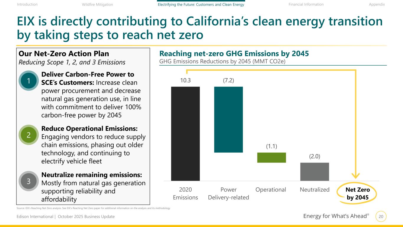 20Edison International | October 2025 Business Update Financial Information AppendixIntroduction Wildfire Mitigation Electrifying the Future: Customers and Clean Energy Neutralize remaining emissions: Mostly from natural gas generation supporting reliability and affordability EIX is directly contributing to California’s clean energy transition by taking steps to reach net zero Deliver Carbon-Free Power to SCE’s Customers: Increase clean power procurement and decrease natural gas generation use, in line with commitment to deliver 100% carbon-free power by 2045 1 2 3 Reduce Operational Emissions: Engaging vendors to reduce supply chain emissions, phasing out older technology, and continuing to electrify vehicle fleet Source: EIX’s Reaching Net Zero analysis. See EIX’s Reaching Net Zero paper for additional information on the analysis and its methodology 10.3 (7.2) (1.1) (2.0) 2020 Emissions Power Delivery-related Operational Neutralized Our Net-Zero Action Plan Reducing Scope 1, 2, and 3 Emissions Reaching net-zero GHG Emissions by 2045 GHG Emissions Reductions by 2045 (MMT CO2e) Net Zero by 2045