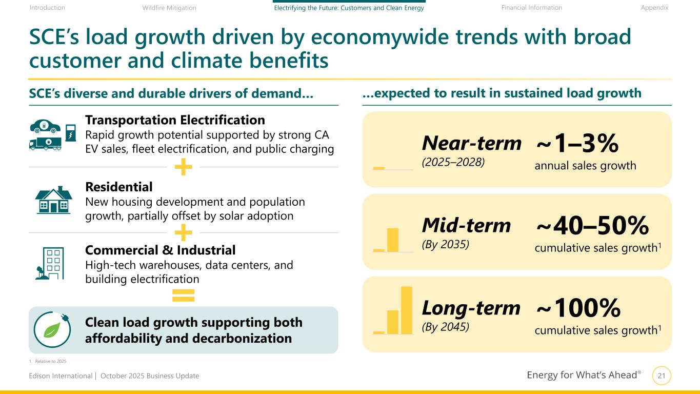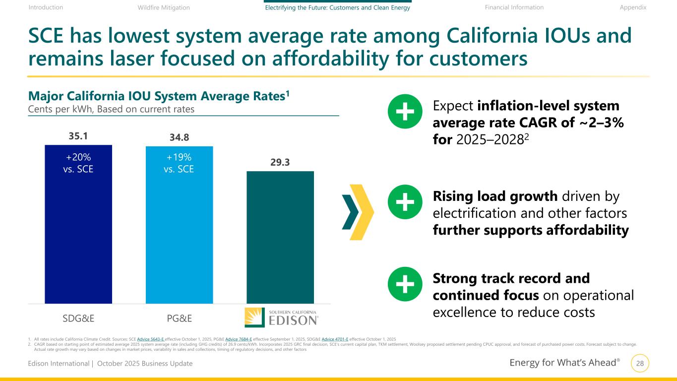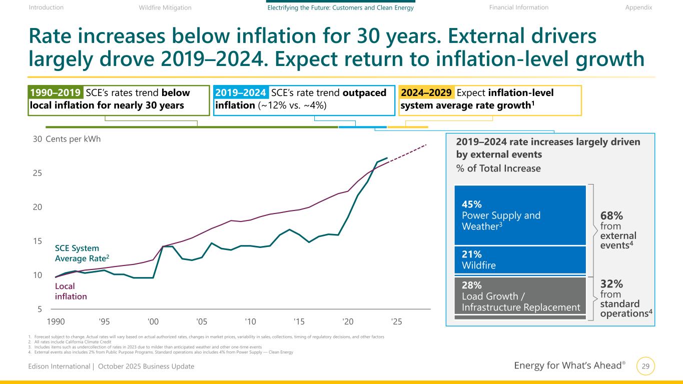 28Edison International | October 2025 Business Update Financial Information AppendixIntroduction Wildfire Mitigation Electrifying the Future: Customers and Clean Energy 35.1 34.8 29.3 SDG&E PG&E SCE SCE has lowest system average rate among California IOUs and remains laser focused on affordability for customers Major California IOU System Average Rates1 Cents per kWh, Based on current rates 1. All rates include California Climate Credit. Sources: SCE Advice 5643-E effective October 1, 2025, PG&E Advice 7684-E effective September 1, 2025, SDG&E Advice 4701-E effective October 1, 2025 2. CAGR based on starting point of estimated average 2025 system average rate (including GHG credits) of 26.9 cents/kWh. Incorporates 2025 GRC final decision, SCE’s current capital plan, TKM settlement, Woolsey proposed settlement pending CPUC approval, and forecast of purchased power costs. Forecast subject to change. Actual rate growth may vary based on changes in market prices, variability in sales and collections, timing of regulatory decisions, and other factors Expect inflation-level system average rate CAGR of ~2–3% for 2025–20282 Rising load growth driven by electrification and other factors further supports affordability Strong track record and continued focus on operational excellence to reduce costs +20% vs. SCE +19% vs. SCE