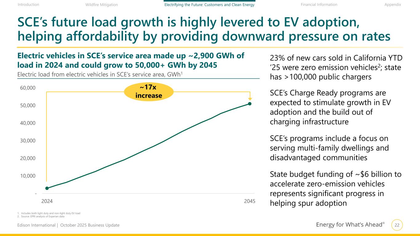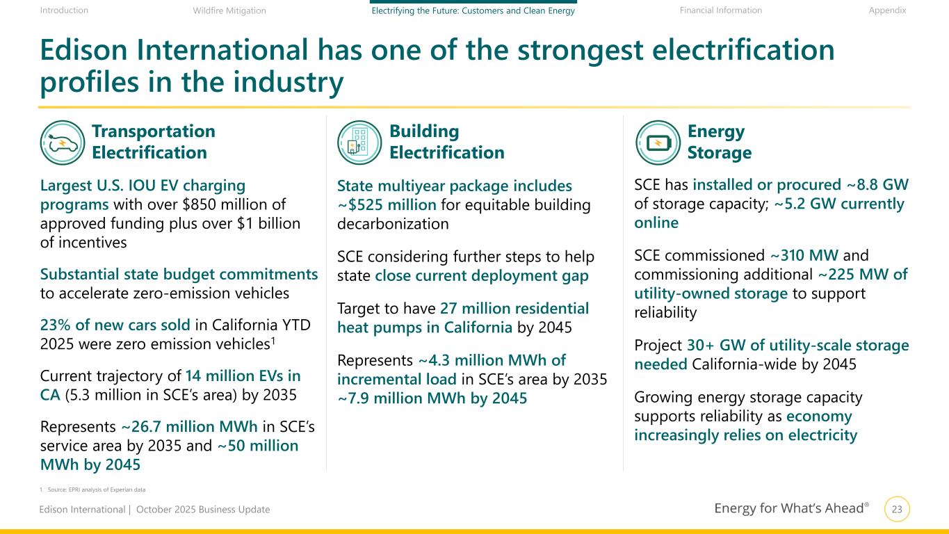 22Edison International | October 2025 Business Update Financial Information AppendixIntroduction Wildfire Mitigation Electrifying the Future: Customers and Clean Energy SCE’s future load growth is highly levered to EV adoption, helping affordability by providing downward pressure on rates 1. Includes both light duty and non-light duty EV load 2. Source: EPRI analysis of Experian data 23% of new cars sold in California YTD ‘25 were zero emission vehicles2; state has >100,000 public chargers SCE’s Charge Ready programs are expected to stimulate growth in EV adoption and the build out of charging infrastructure SCE’s programs include a focus on serving multi-family dwellings and disadvantaged communities State budget funding of ~$6 billion to accelerate zero-emission vehicles represents significant progress in helping spur adoption - 10,000 20,000 30,000 40,000 50,000 60,000 2024 2045 Electric vehicles in SCE’s service area made up ~2,900 GWh of load in 2024 and could grow to 50,000+ GWh by 2045 Electric load from electric vehicles in SCE’s service area, GWh1 ~17x increase