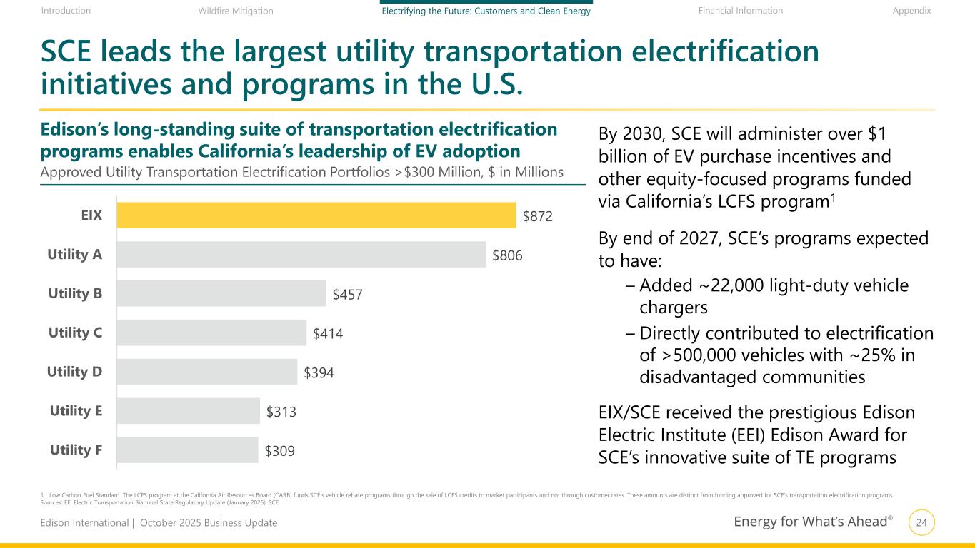 24Edison International | October 2025 Business Update Financial Information AppendixIntroduction Wildfire Mitigation Electrifying the Future: Customers and Clean Energy $872 $806 $457 $414 $394 $313 $309 EIX Utility A Utility B Utility C Utility D Utility E Utility F SCE leads the largest utility transportation electrification initiatives and programs in the U.S. 1. Low Carbon Fuel Standard. The LCFS program at the California Air Resources Board (CARB) funds SCE’s vehicle rebate programs through the sale of LCFS credits to market participants and not through customer rates. These amounts are distinct from funding approved for SCE’s transportation electrification programs Sources: EEI Electric Transportation Biannual State Regulatory Update (January 2025), SCE Edison’s long-standing suite of transportation electrification programs enables California’s leadership of EV adoption Approved Utility Transportation Electrification Portfolios >$300 Million, $ in Millions By 2030, SCE will administer over $1 billion of EV purchase incentives and other equity-focused programs funded via California’s LCFS program1 By end of 2027, SCE’s programs expected to have: – Added ~22,000 light-duty vehicle chargers – Directly contributed to electrification of >500,000 vehicles with ~25% in disadvantaged communities EIX/SCE received the prestigious Edison Electric Institute (EEI) Edison Award for SCE’s innovative suite of TE programs