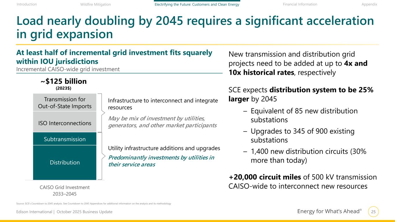 25Edison International | October 2025 Business Update Financial Information AppendixIntroduction Wildfire Mitigation Electrifying the Future: Customers and Clean Energy Load nearly doubling by 2045 requires a significant acceleration in grid expansion Source: SCE’s Countdown to 2045 analysis. See Countdown to 2045 Appendices for additional information on the analysis and its methodology CAISO Grid Investment 2033–2045 At least half of incremental grid investment fits squarely within IOU jurisdictions Incremental CAISO-wide grid investment ~$125 billion (2023$) Transmission for Out-of-State Imports ISO Interconnections Distribution Subtransmission Infrastructure to interconnect and integrate resources May be mix of investment by utilities, generators, and other market participants Utility infrastructure additions and upgrades Predominantly investments by utilities in their service areas New transmission and distribution grid projects need to be added at up to 4x and 10x historical rates, respectively SCE expects distribution system to be 25% larger by 2045 – Equivalent of 85 new distribution substations – Upgrades to 345 of 900 existing substations – 1,400 new distribution circuits (30% more than today) +20,000 circuit miles of 500 kV transmission CAISO-wide to interconnect new resources