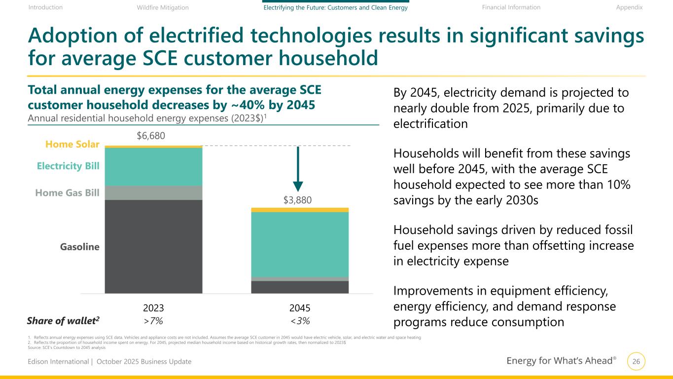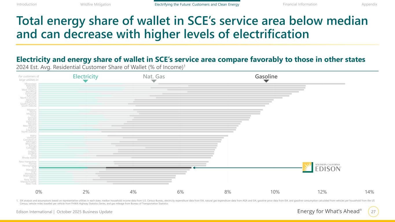 27Edison International | October 2025 Business Update Financial Information AppendixIntroduction Wildfire Mitigation Electrifying the Future: Customers and Clean Energy 0% 2% 4% 6% 8% 10% 12% 14% Mississippi Nebraska Alabama West Virginia Wyoming Tennessee Arkansas North Carolina Kentucky Oklahoma South Carolina South Dakota Missouri Maine Montana Texas Georgia Arizona Delaware Nevada New Mexico Indiana Louisiana North Dakota Idaho Vermont Connecticut Michigan Wisconsin Kansas Colorado Ohio Oregon Virginia Iowa Rhode Island New Hampshire Florida Pennsylvania SCE Maryland Utah Minnesota Washington Illinois New Jersey Massachusetts New York Total energy share of wallet in SCE’s service area below median and can decrease with higher levels of electrification 2024 Est. Avg. Residential Customer Share of Wallet (% of Income)1 Electricity Nat. Gas GasolineFor customers of large utilities in: Electricity and energy share of wallet in SCE’s service area compare favorably to those in other states 1. EIX analysis and assumptions based on representative utilities in each state, median household income data from U.S. Census Bureau, electricity expenditure data from EIA, natural gas expenditure data from AGA and EIA, gasoline price data from EIA, and gasoline consumption calculated from vehicles per household from the US Census, vehicle-miles traveled per vehicle from FHWA Highway Statistics Series, and gas mileage from Bureau of Transportation Statistics