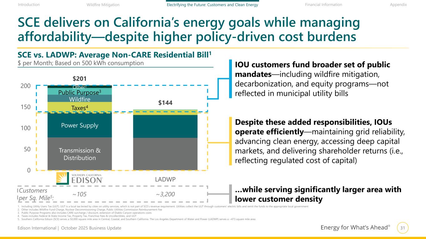 30Edison International | October 2025 Business Update Financial Information AppendixIntroduction Wildfire Mitigation Electrifying the Future: Customers and Clean Energy Composition of Bundled System Revenue Requirement1 5% Transmission Investment in operations and maintenance for high-voltage transmission lines 32% Distribution Grid maintenance and new equipment, including poles, wires, and substations 10% Wildfire Covered conductor, vegetation clearing, enhanced inspections, weather stations, HD cameras, and insurance 5% Public Purpose Programs Mandated state programs, including incentives for energy efficiency and protection for low-income customers 11% Taxes Federal, state, county, and city taxes and uncollectibles 37% Power Supply Cost of energy sources, including natural gas, hydro, solar, and wind 1. Based on rates as of October 1, 2025