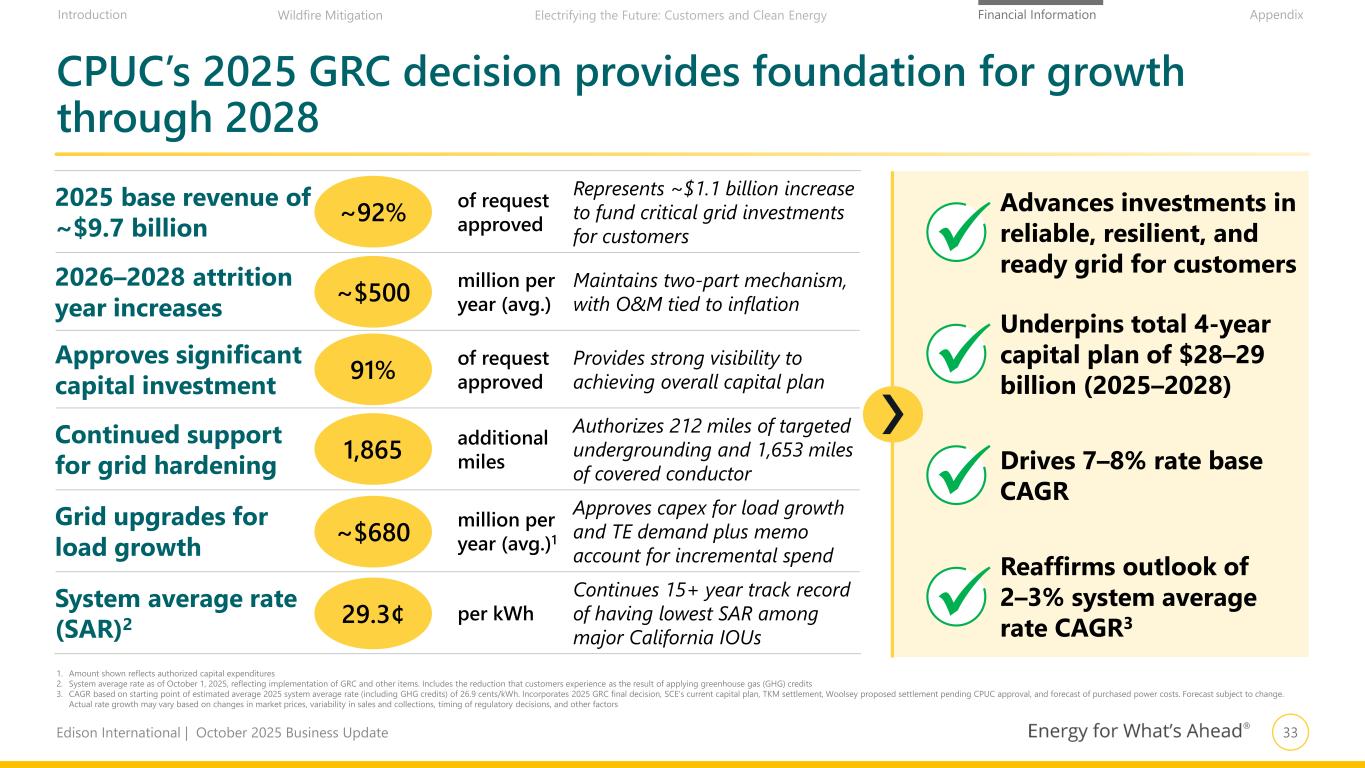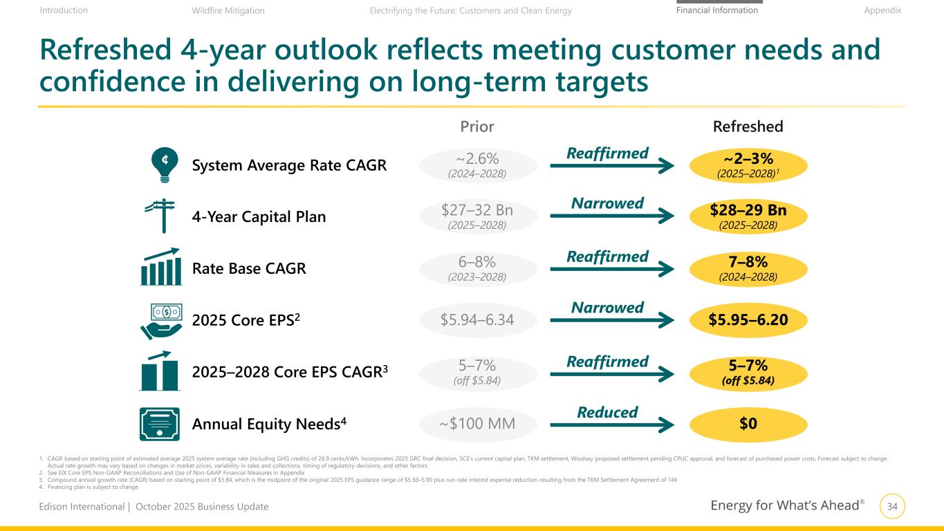 33Edison International | October 2025 Business Update Financial Information AppendixIntroduction Wildfire Mitigation Electrifying the Future: Customers and Clean Energy CPUC’s 2025 GRC decision provides foundation for growth through 2028 2025 base revenue of ~$9.7 billion of request approved Represents ~$1.1 billion increase to fund critical grid investments for customers 2026–2028 attrition year increases million per year (avg.) Maintains two-part mechanism, with O&M tied to inflation Approves significant capital investment of request approved Provides strong visibility to achieving overall capital plan Continued support for grid hardening additional miles Authorizes 212 miles of targeted undergrounding and 1,653 miles of covered conductor Grid upgrades for load growth million per year (avg.)1 Approves capex for load growth and TE demand plus memo account for incremental spend System average rate (SAR)2 per kWh Continues 15+ year track record of having lowest SAR among major California IOUs 1. Amount shown reflects authorized capital expenditures 2. System average rate as of October 1, 2025, reflecting implementation of GRC and other items. Includes the reduction that customers experience as the result of applying greenhouse gas (GHG) credits 3. CAGR based on starting point of estimated average 2025 system average rate (including GHG credits) of 26.9 cents/kWh. Incorporates 2025 GRC final decision, SCE’s current capital plan, TKM settlement, Woolsey proposed settlement pending CPUC approval, and forecast of purchased power costs. Forecast subject to change. Actual rate growth may vary based on changes in market prices, variability in sales and collections, timing of regulatory decisions, and other factors ~92% ~$500 91% 1,865 ~$680 29.3¢ Advances investments in reliable, resilient, and ready grid for customers Underpins total 4-year capital plan of $28–29 billion (2025–2028) Drives 7–8% rate base CAGR Reaffirms outlook of 2–3% system average rate CAGR3    