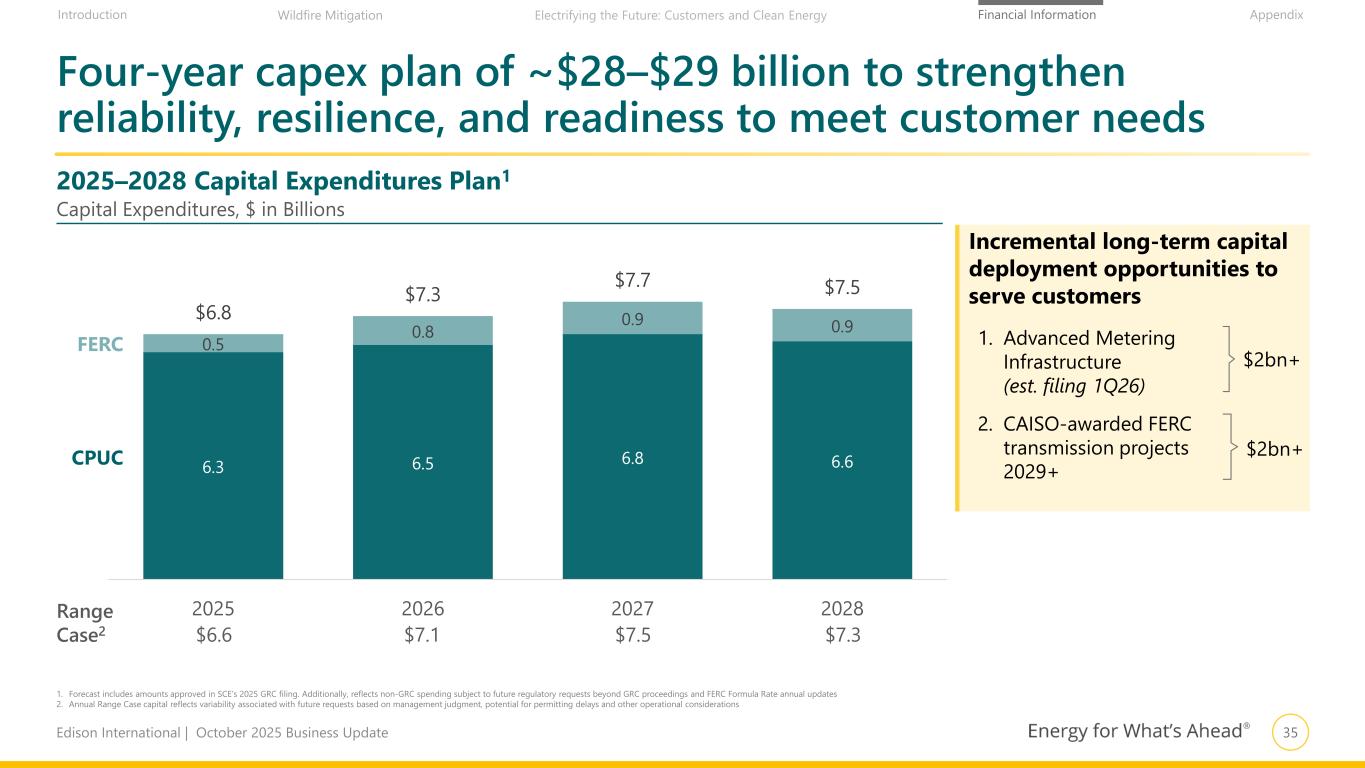 35Edison International | October 2025 Business Update Financial Information AppendixIntroduction Wildfire Mitigation Electrifying the Future: Customers and Clean Energy 2025–2028 Capital Expenditures Plan1 Four-year capex plan of ~$28–$29 billion to strengthen reliability, resilience, and readiness to meet customer needs Capital Expenditures, $ in Billions 1. Forecast includes amounts approved in SCE’s 2025 GRC filing. Additionally, reflects non-GRC spending subject to future regulatory requests beyond GRC proceedings and FERC Formula Rate annual updates 2. Annual Range Case capital reflects variability associated with future requests based on management judgment, potential for permitting delays and other operational considerations Incremental long-term capital deployment opportunities to serve customers 1. Advanced Metering Infrastructure (est. filing 1Q26) 2. CAISO-awarded FERC transmission projects 2029+ $2bn+ $2bn+ 6.3 6.5 6.8 6.6 0.5 0.8 0.9 0.9 $6.8 $7.3 $7.7 $7.5 2025 2026 2027 2028Range Case2 $6.6 $7.1 $7.5 $7.3 CPUC FERC