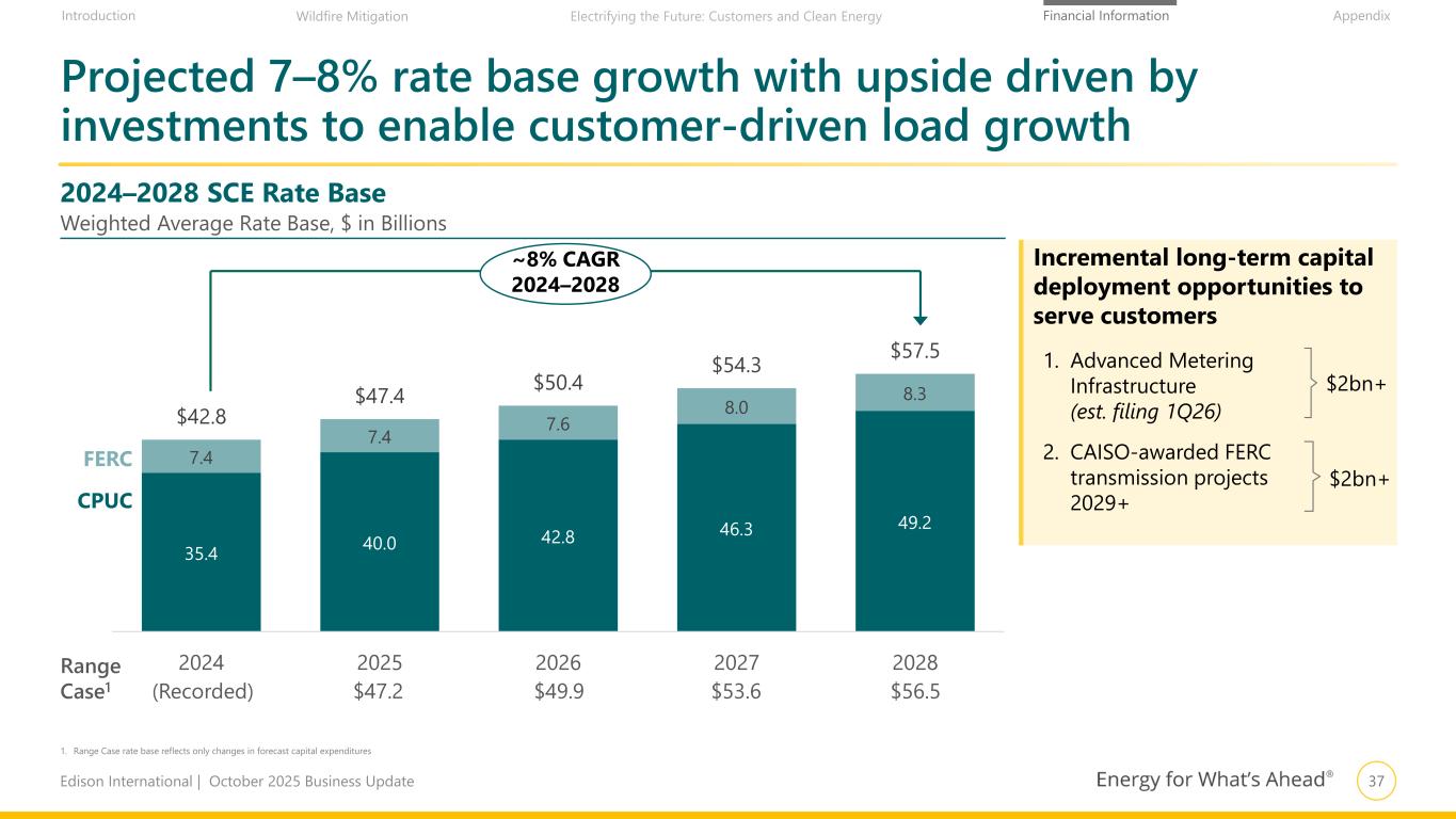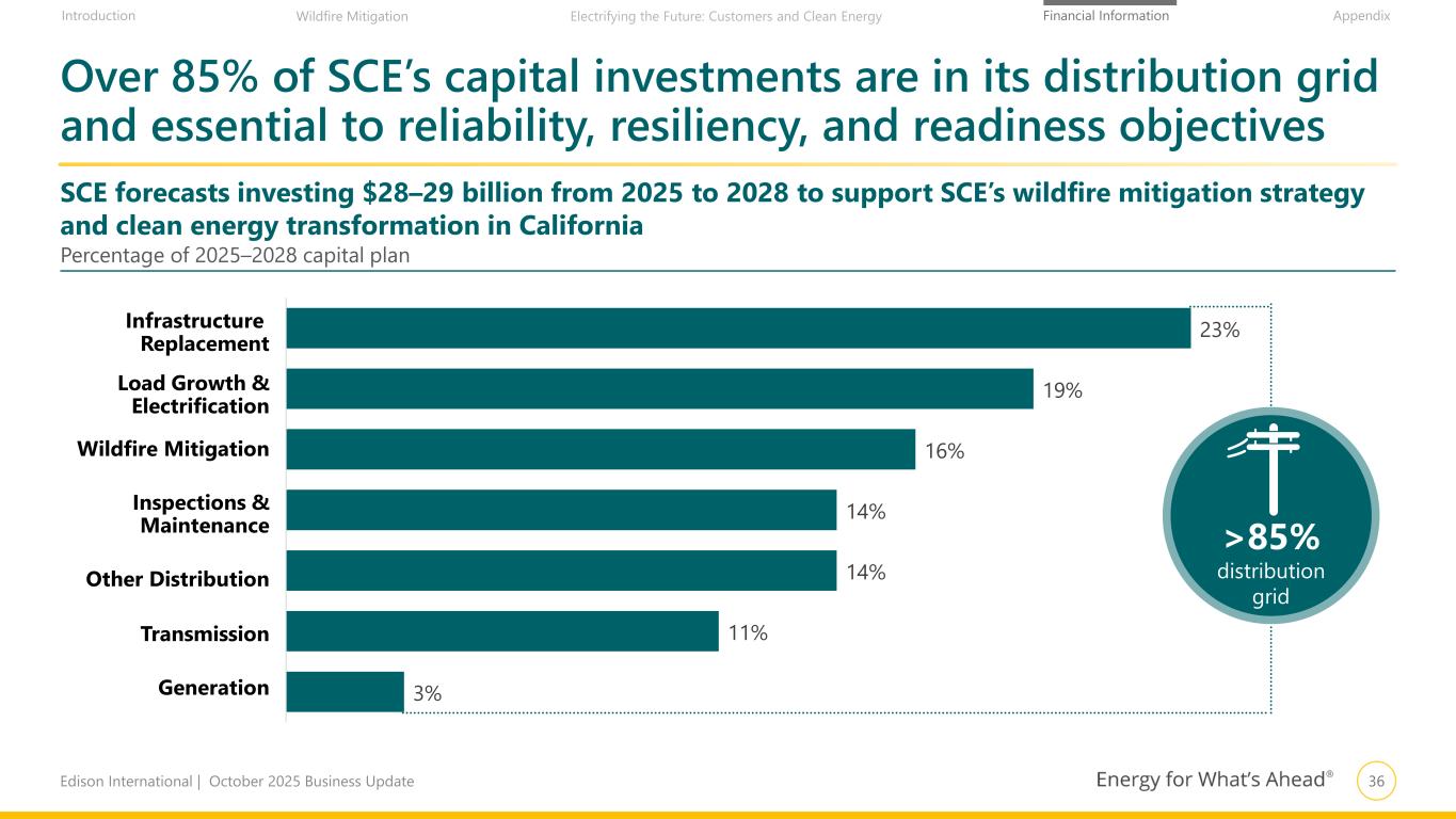 36Edison International | October 2025 Business Update Financial Information AppendixIntroduction Wildfire Mitigation Electrifying the Future: Customers and Clean Energy Over 85% of SCE’s capital investments are in its distribution grid and essential to reliability, resiliency, and readiness objectives >85% distribution grid SCE forecasts investing $28–29 billion from 2025 to 2028 to support SCE’s wildfire mitigation strategy and clean energy transformation in California Percentage of 2025–2028 capital plan 23% 19% 16% 14% 14% 11% 3% Infrastructure Replacement Load Growth & Electrification Wildfire Mitigation Inspections & Maintenance Other Distribution Transmission Generation