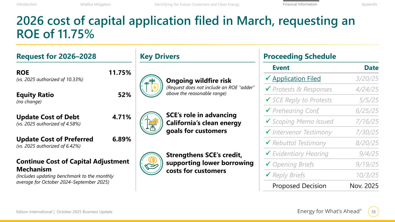 38Edison International | October 2025 Business Update Financial Information AppendixIntroduction Wildfire Mitigation Electrifying the Future: Customers and Clean Energy Ongoing wildfire risk (Request does not include an ROE “adder" above the reasonable range) SCE’s role in advancing California’s clean energy goals for customers Strengthens SCE’s credit, supporting lower borrowing costs for customers 2026 cost of capital application filed in March, requesting an ROE of 11.75% Request for 2026–2028 ROE (vs. 2025 authorized of 10.33%) 11.75% Equity Ratio (no change) 52% Update Cost of Debt (vs. 2025 authorized of 4.58%) 4.71% Update Cost of Preferred (vs. 2025 authorized of 6.42%) 6.89% Continue Cost of Capital Adjustment Mechanism (Includes updating benchmark to the monthly average for October 2024–September 2025) Key Drivers Proceeding Schedule Event Date  Application Filed 3/20/25  Protests & Responses 4/24/25  SCE Reply to Protests 5/5/25  Prehearing Conf. 6/25/25  Scoping Memo Issued 7/16/25  Intervenor Testimony 7/30/25  Rebuttal Testimony 8/20/25  Evidentiary Hearing 9/4/25  Opening Briefs 9/19/25  Reply Briefs 10/3/25 Proposed Decision Nov. 2025